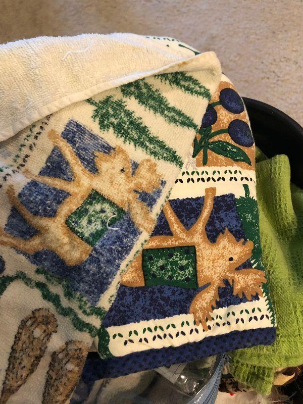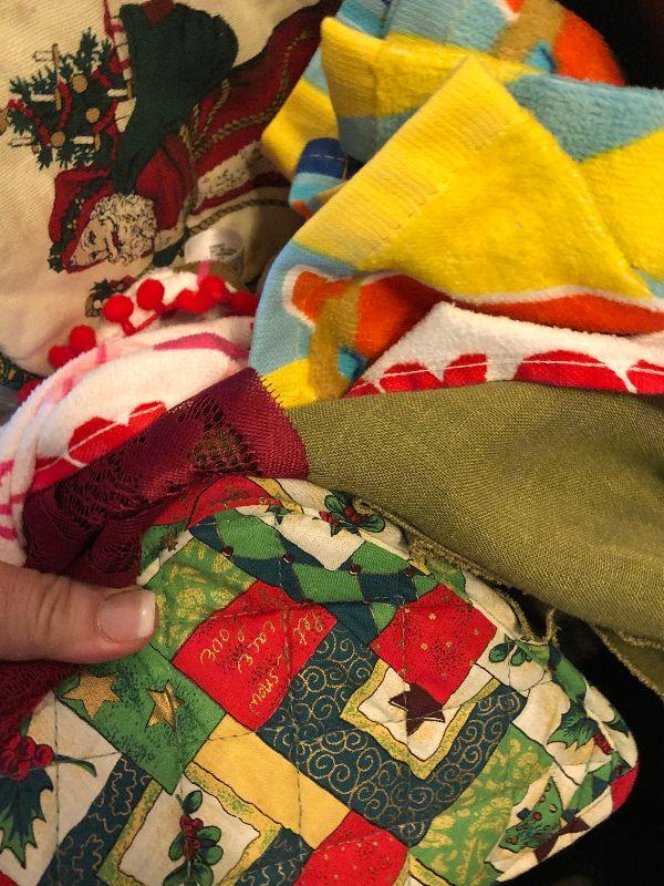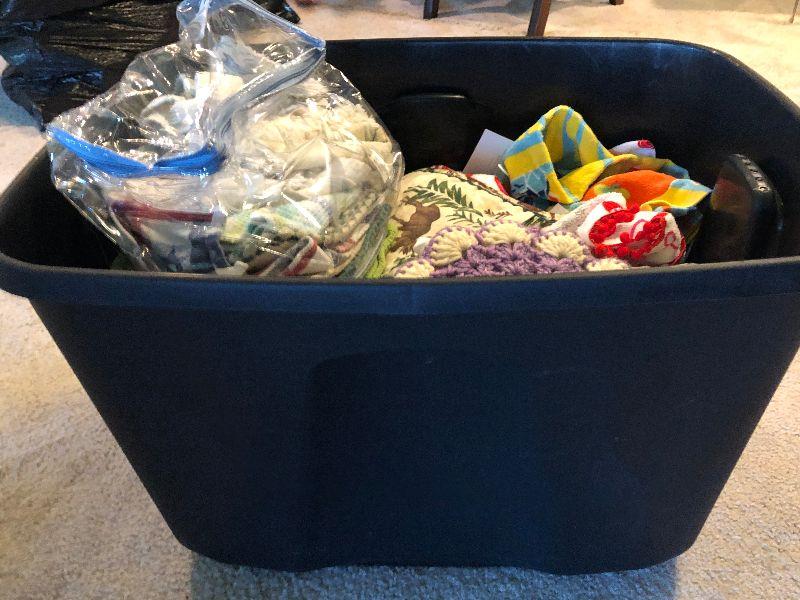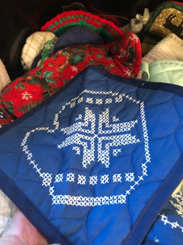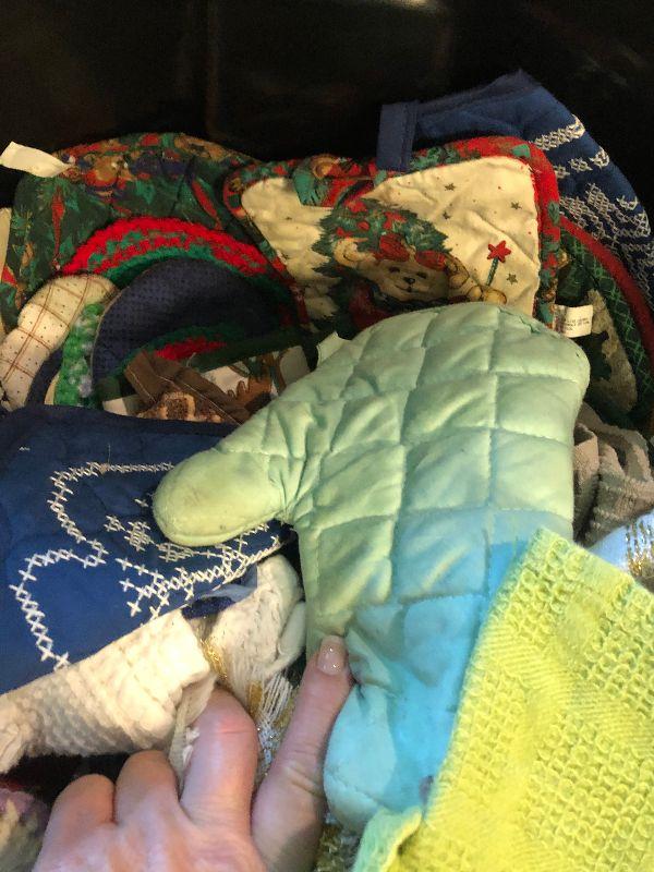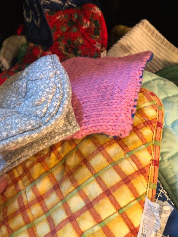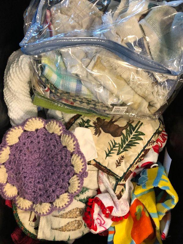 Tote Full of Kitchen linens, pot holder, dish towels etc. Pictures say it best! Please see all pictures for exactly what is in the lot, the condition of the item/s, and the measurements if needed. Thank you for looking and have fun bidding!