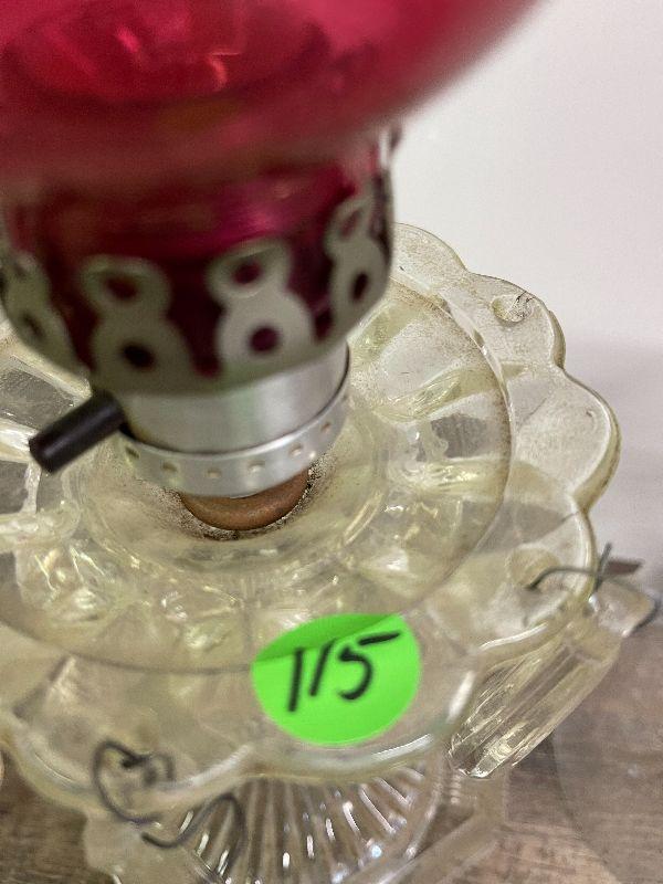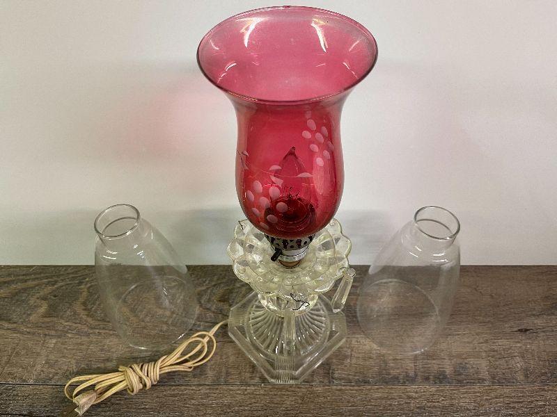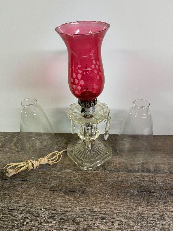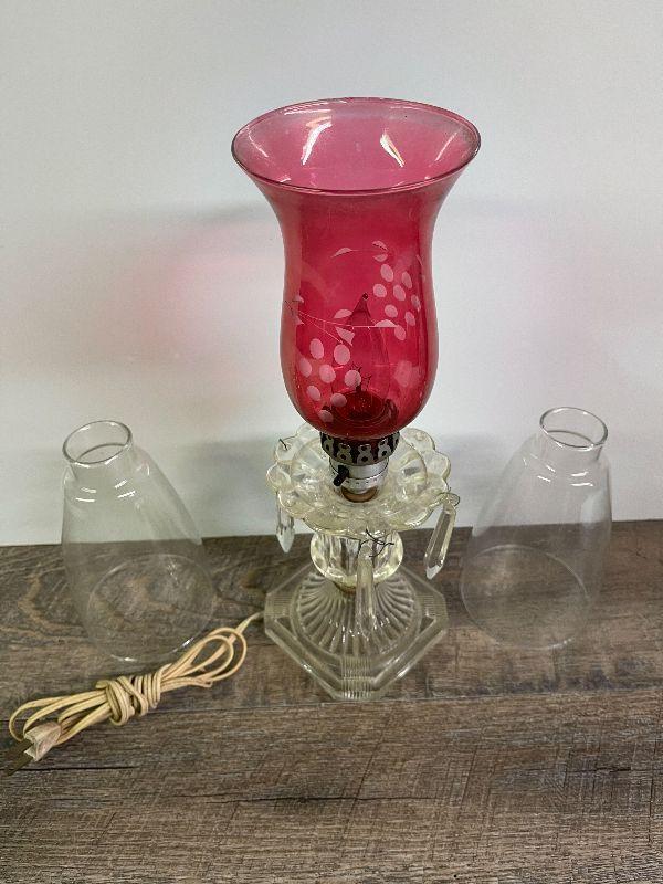 Cranberry color glass hurricanes lamp with crystals. Please see all pictures for condition and measurements if taken. All items are sold as found and if furniture, you will need to be able to move yourself. Thank you for looking and have fun bidding! As always, thank you for being a Treasure Me Hunter!
