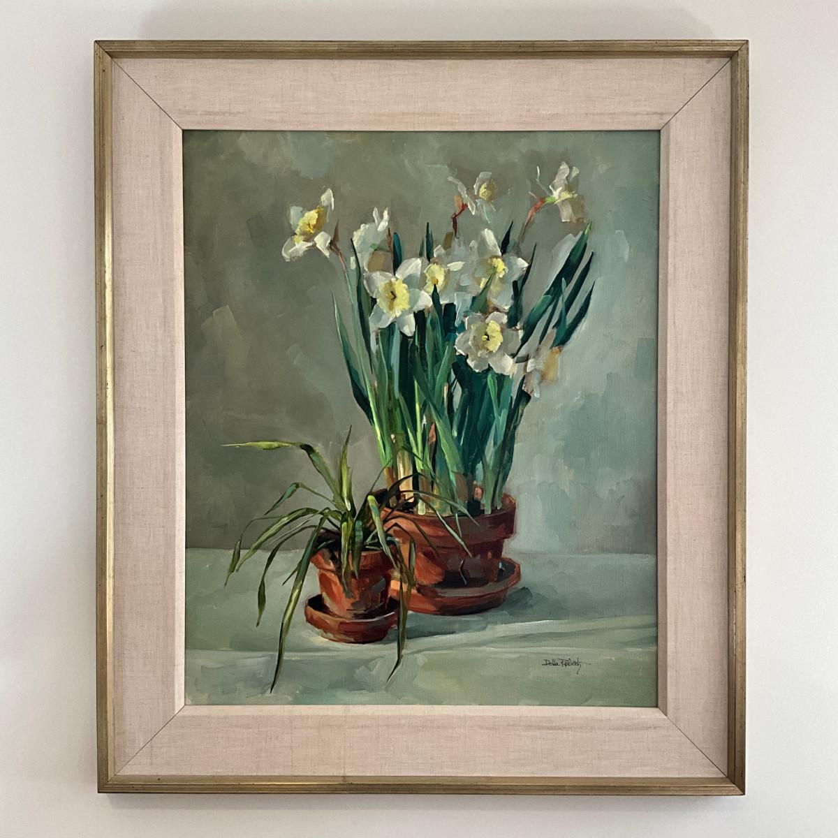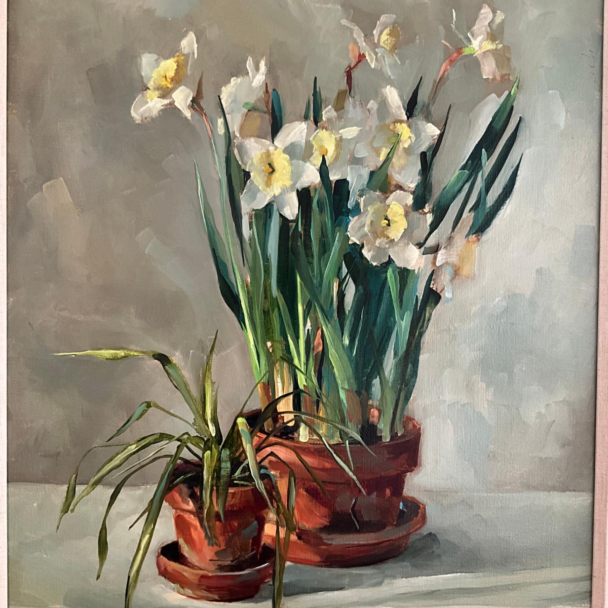 L116 Original Oil On Canvas Painting Of Daffodils In Terracotta Pots Signed By Della Roberts