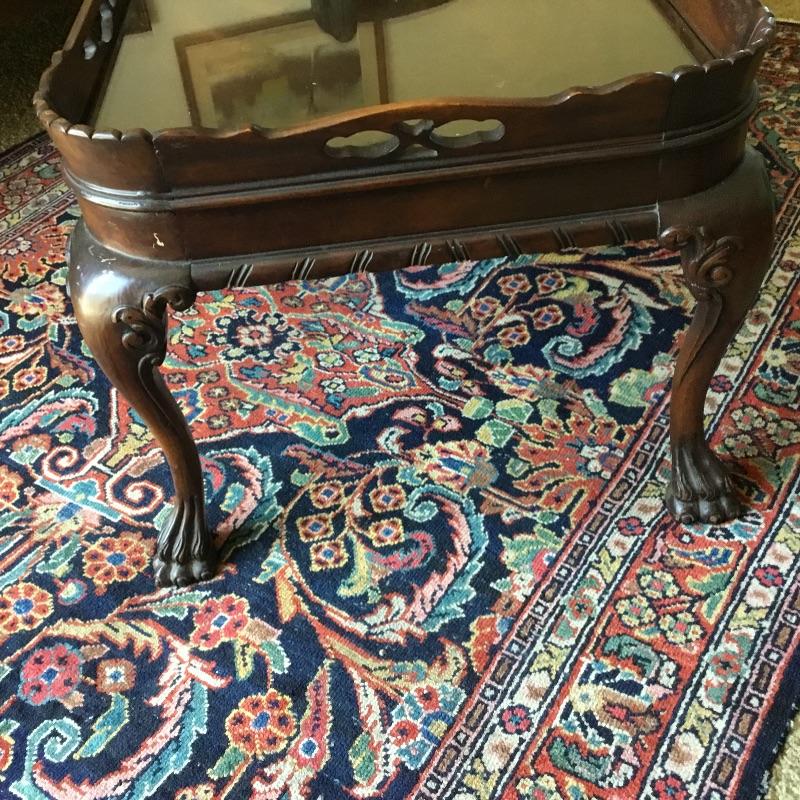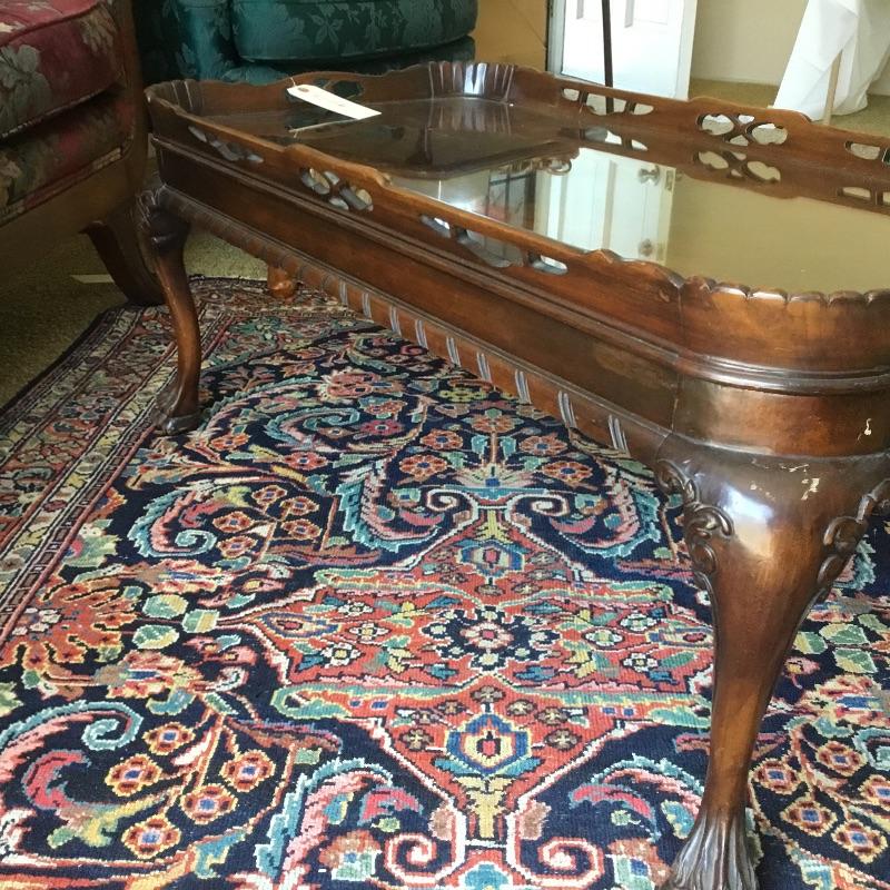 Antique pie crust style coffee table, measures approximately 38 inches wide by 20 inches deep by 16 inches high with glass insert