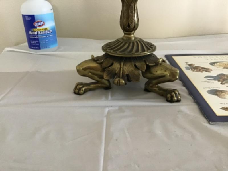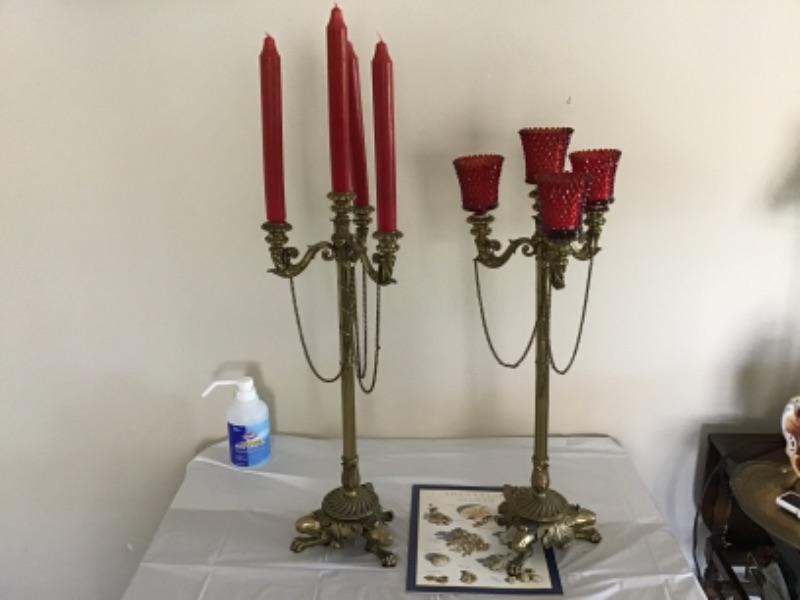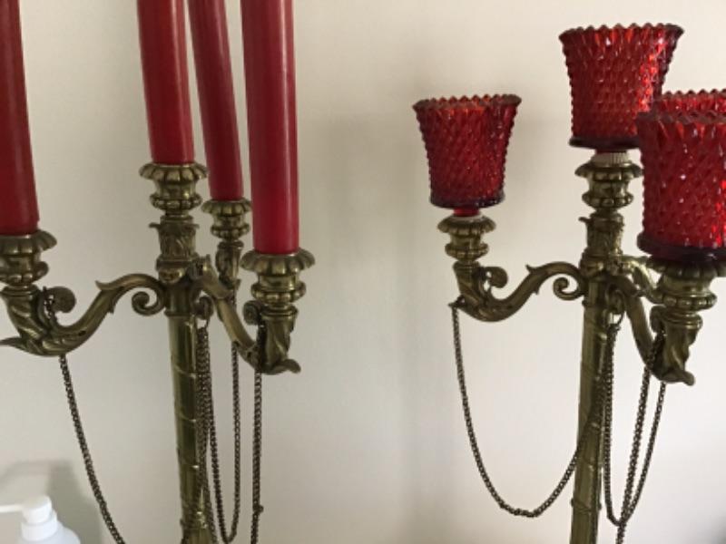 Pair of unique heavy brass candelabras. Measure approximately 23 inches high without candles and 8 inches of crossed.