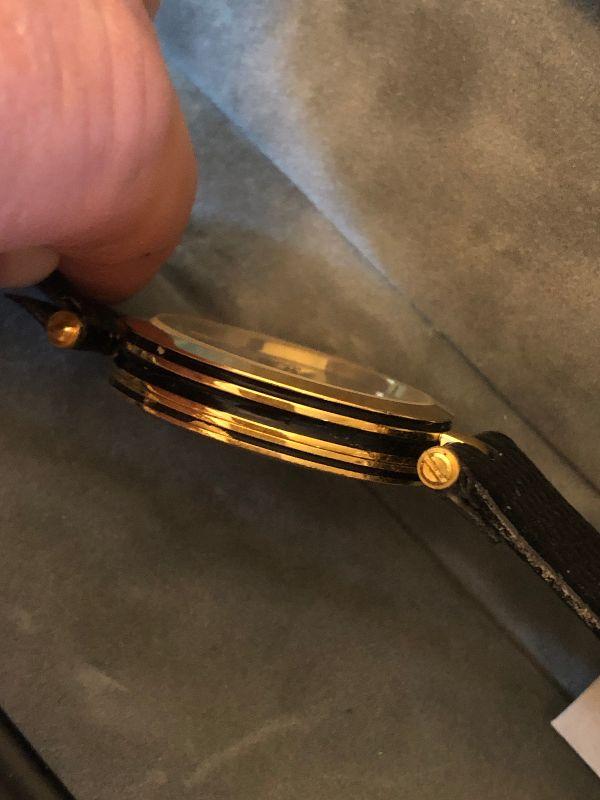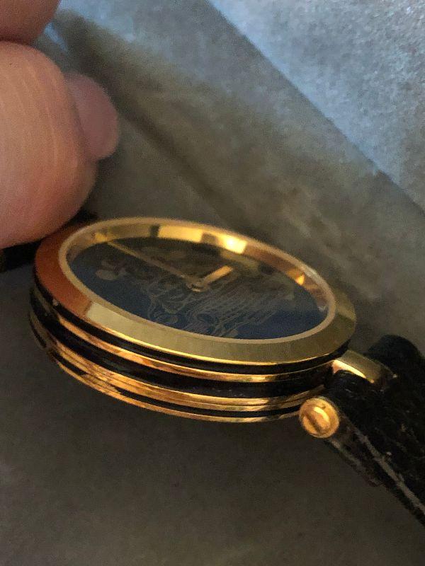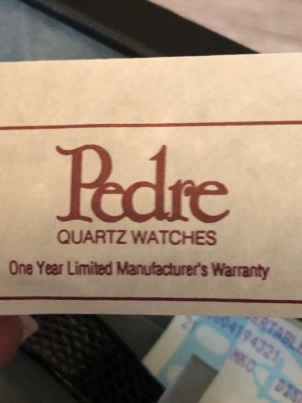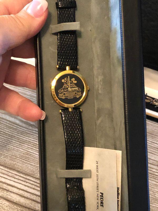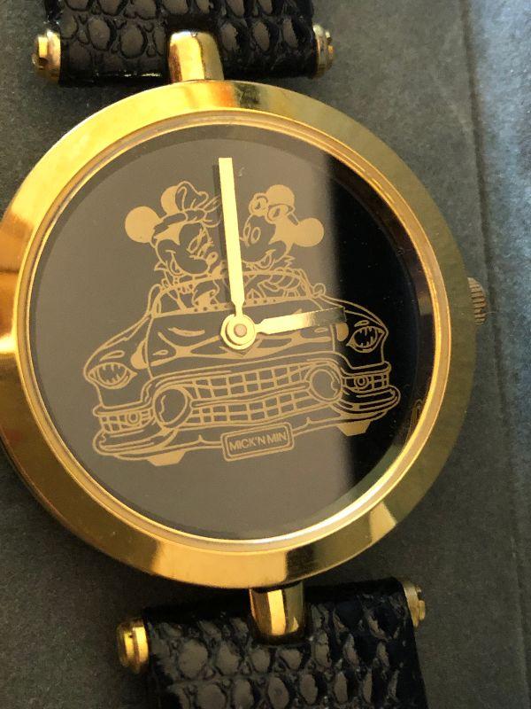 Mickey and Minnie watch with black leather band made by Pedre. Untested.
