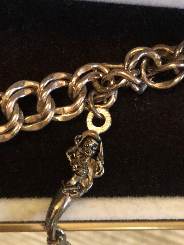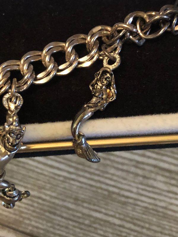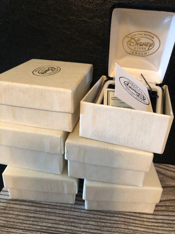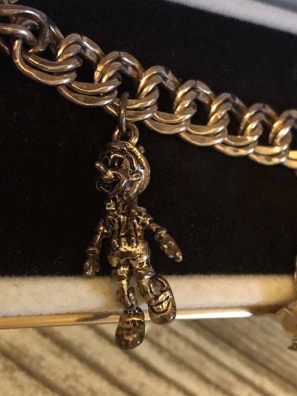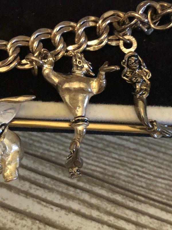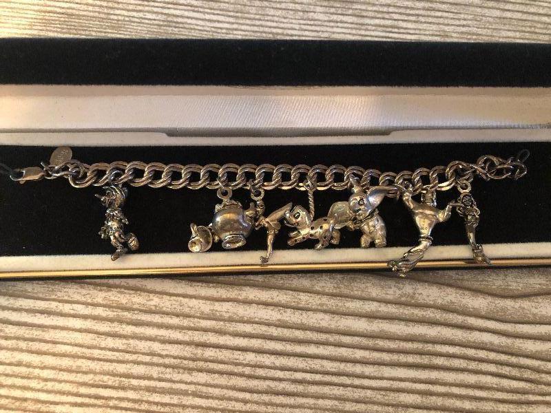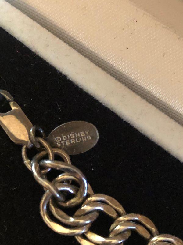 Sterling Silver Disney bracelet with 7 silver Disney charms in orginal box. Each charm comes with its orginal box. Please see all pictures for contents of the lot, the condition of items in the lot, and measurements of the items if taken. Thank you for looking and have fun bidding.