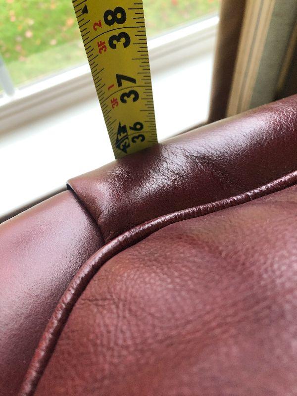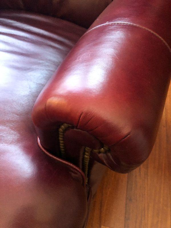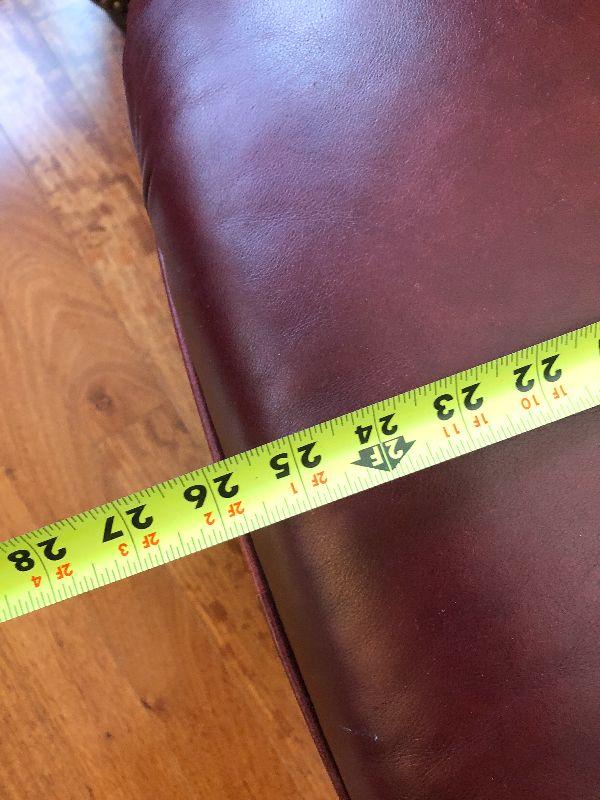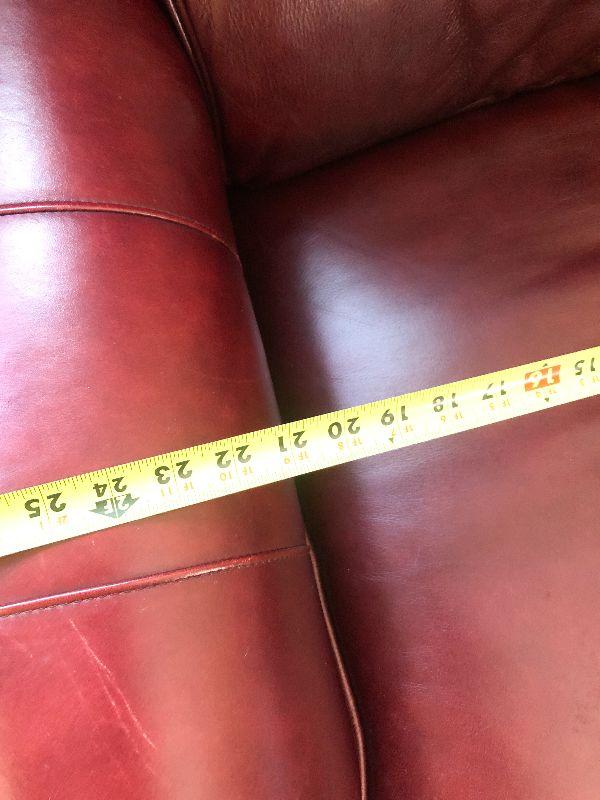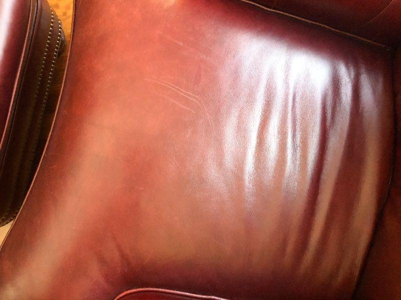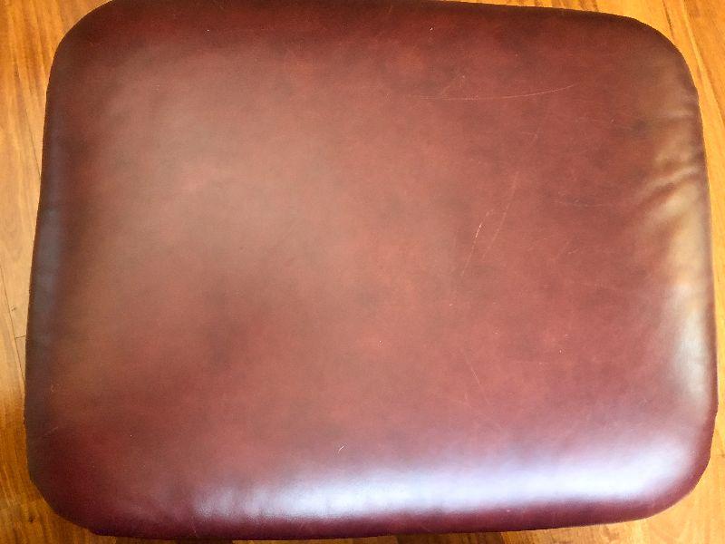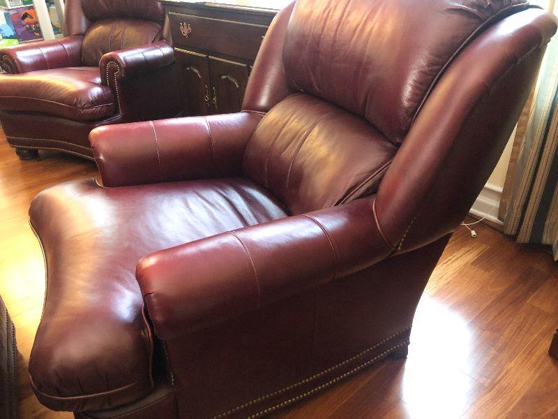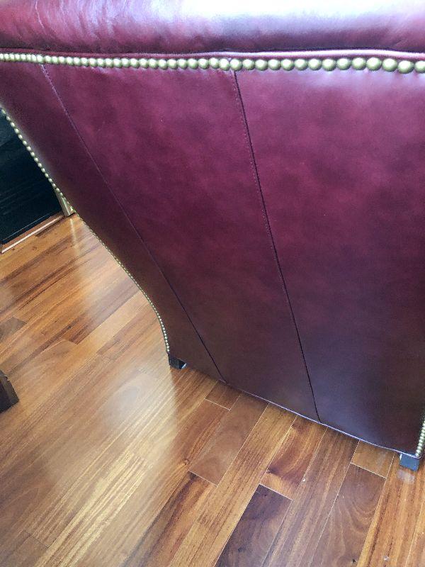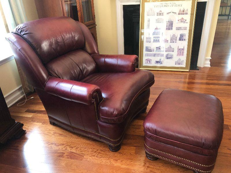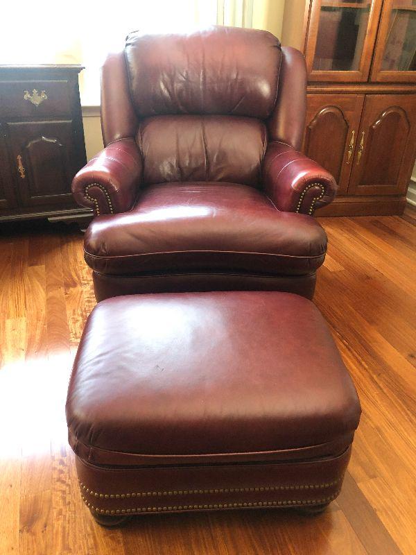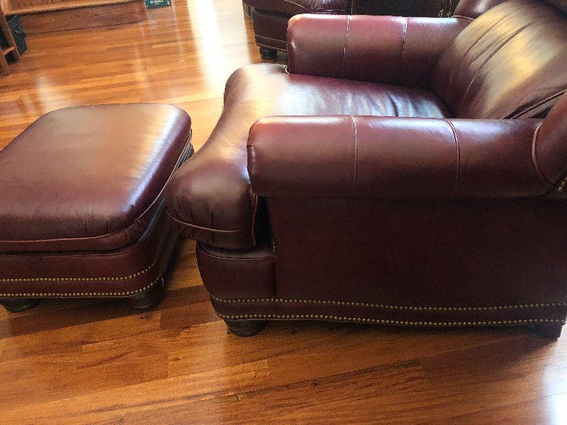 Beautiful Austin High Back burgundy/red leather arm chair and ottoman in excellent condition. Matches other armchair and sofa. Please refer to photos for size and condition. Have fun and happy bidding.