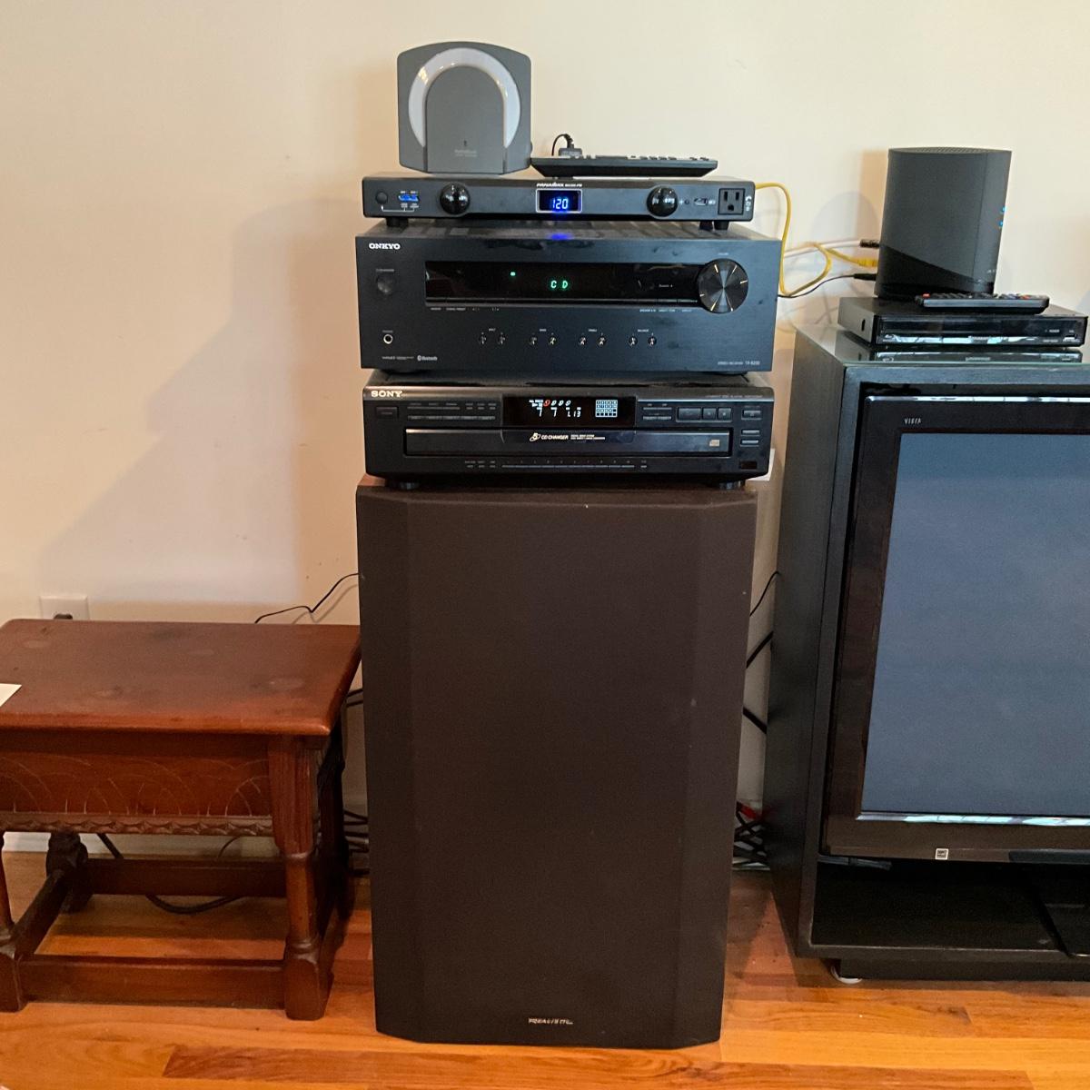 Comes with RadioShack Antenna, Sony disc player, onkyo reciever, and Panamax audio/video surge protector