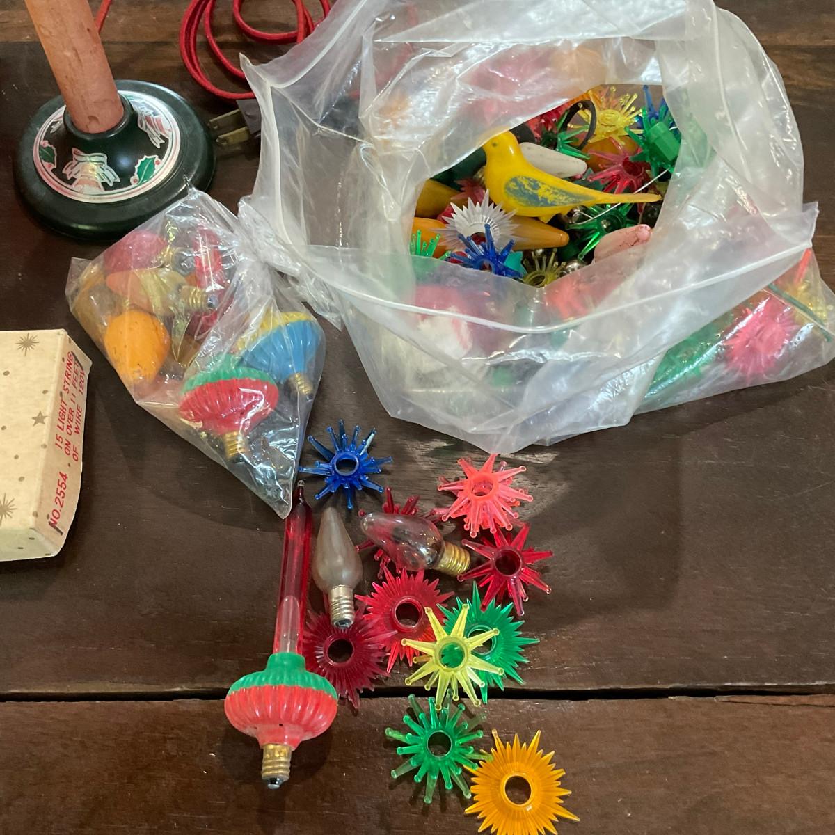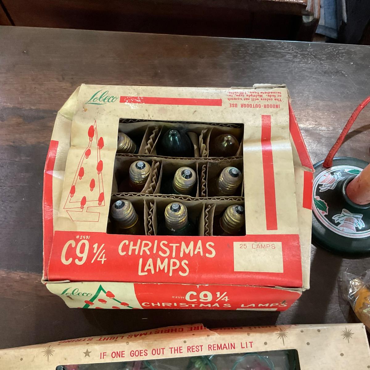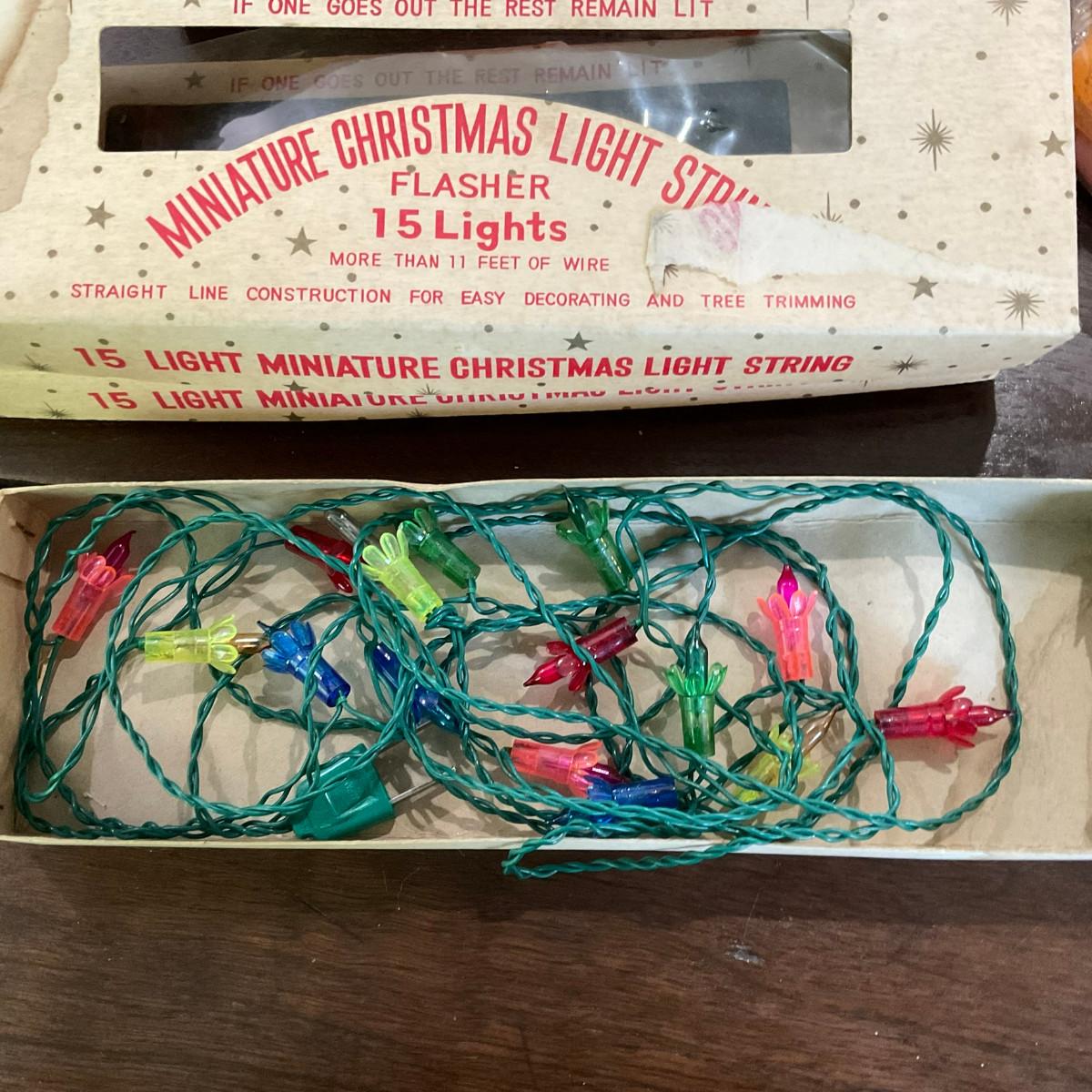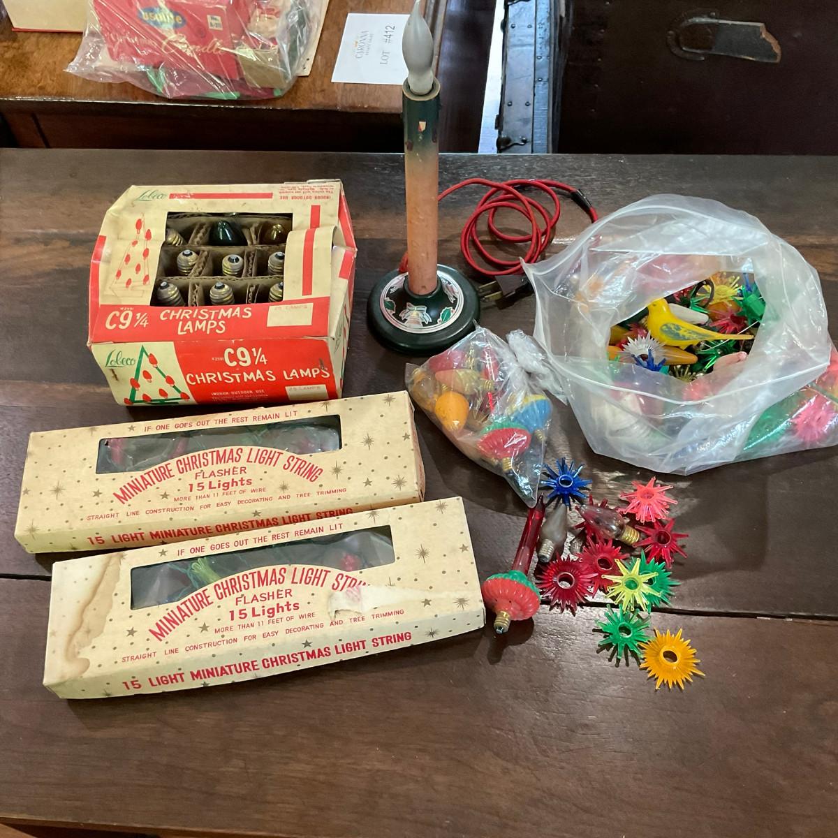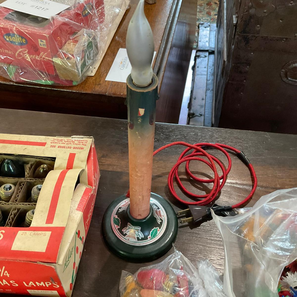 L1219 Set of Two Vintage Mini Christmas Lights With Bulbs With Antique Christmas Decor & Candlestick Lamp