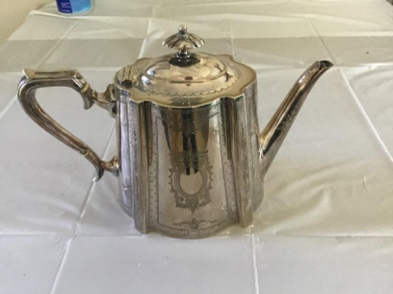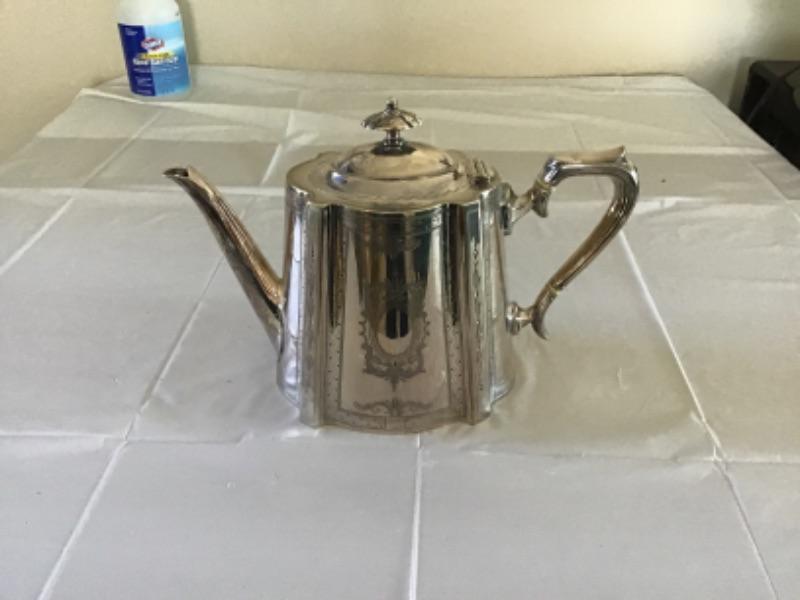 Silver plate teapot. Measures approximately 7 1/2 inches high by 11 inches wide, includes handle and spout.
