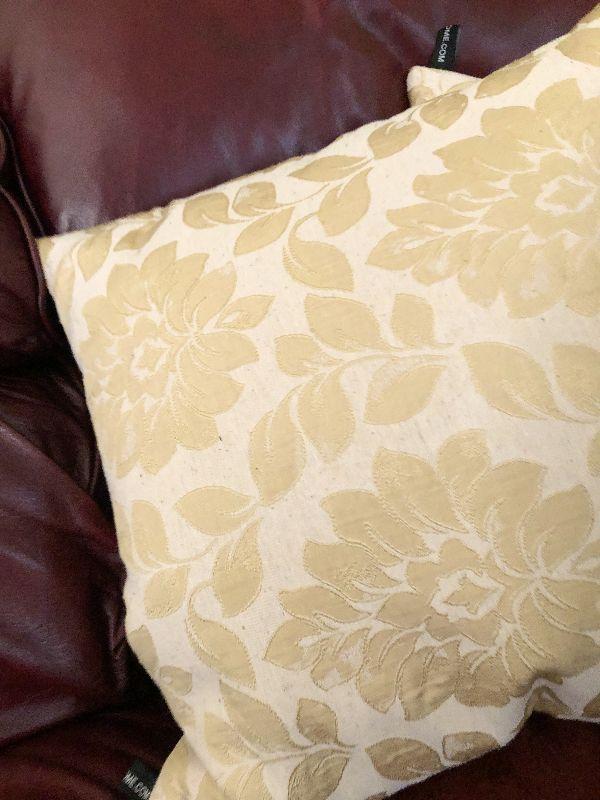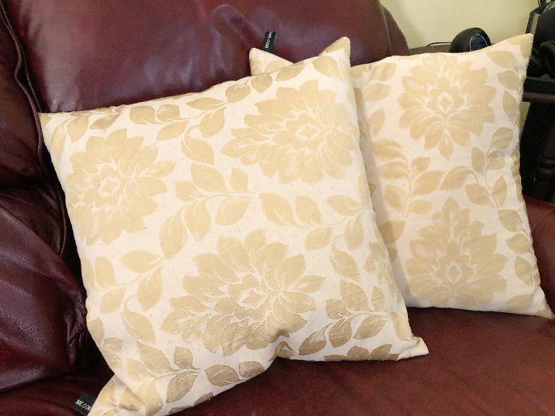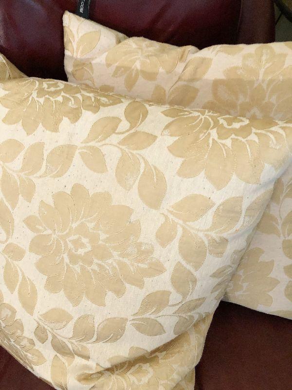 Gold and Cream Pillows 16". Please refer to photos for size and condition. Have fun and happy bidding.