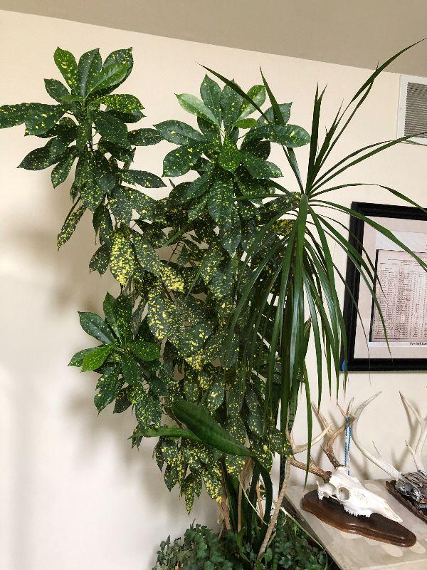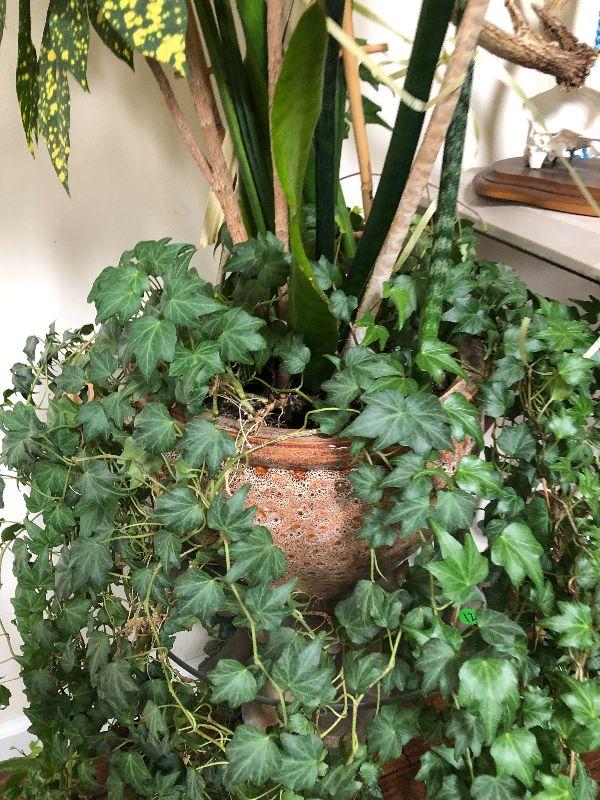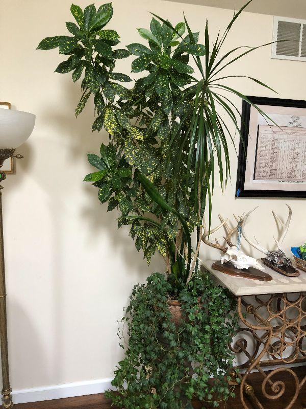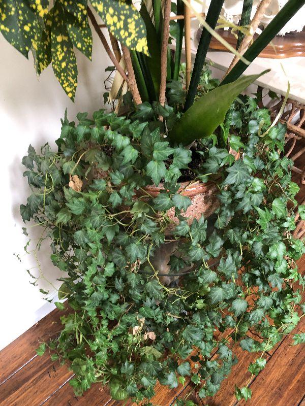 Large indoor house plant is a mix with palms, ivy, etc in beautiful planter. Plant is 5 FT tall. Please see all pictures for condition and measurements if taken. All items are sold as found and if furniture, you will need to be able to move yourself. Thank you for looking and have fun bidding! As always, thank you for being a Treasure Me Hunter!