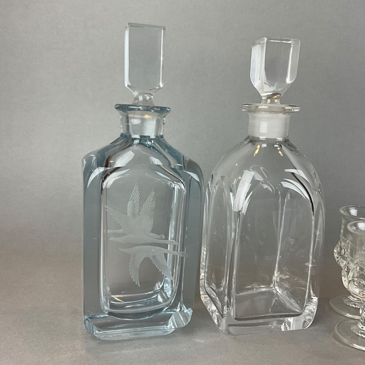 One etched flying geese decanter with clear decanter by Orrefors - clear decanter has chip on bottom