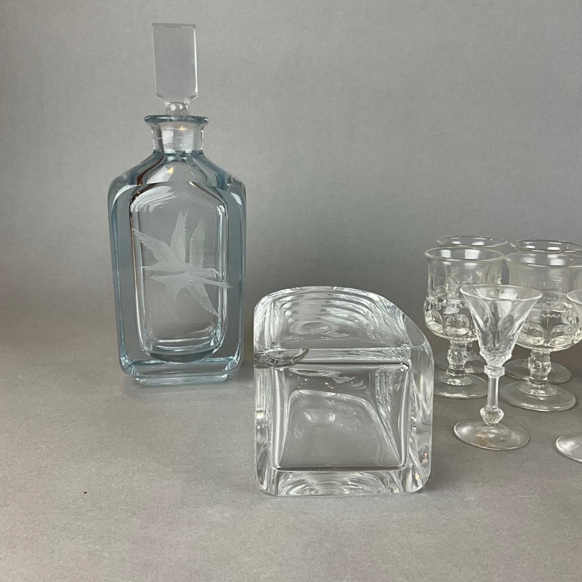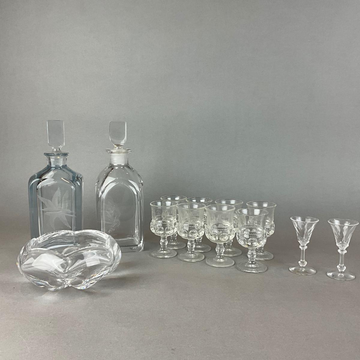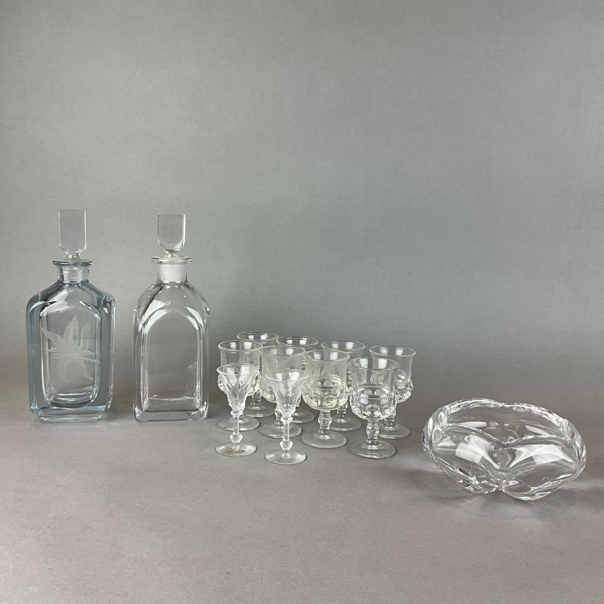 L1334 Lot of Two Orrefors Decanters & Bowl with Vintage Glass Cordials