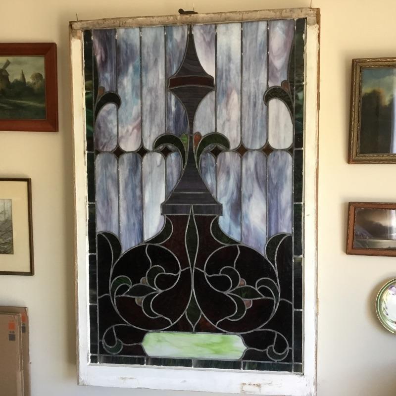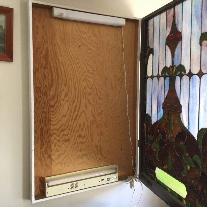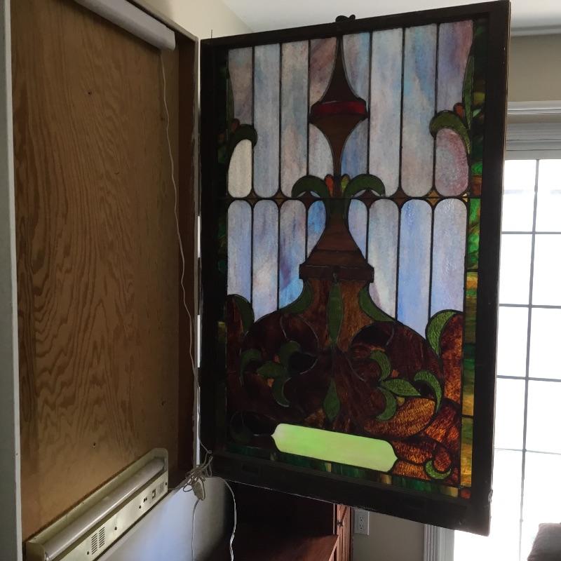 Antique Stainglass window, Beautiful colors when the light shines through. I could not get the backlighting to work, needs repair. Window is in great condition. Measures approximately 36 inches wide I 55 inches high by 4 inches deep. .