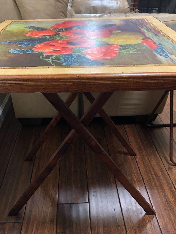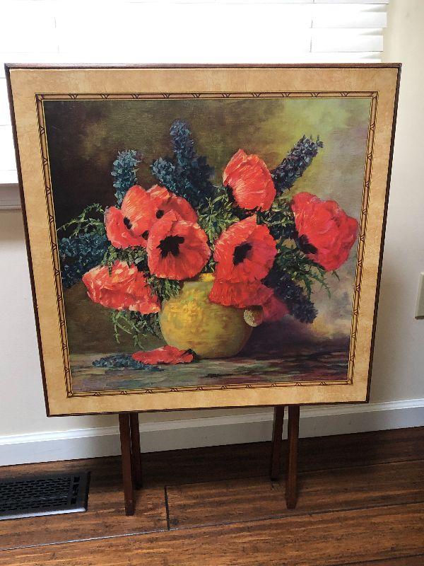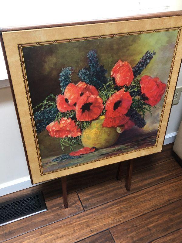 Vintage folding card table has beautiful floral print. Please see all pictures for condition and measurements if taken. All items are sold as found and if furniture, you will need to be able to move yourself. Thank you for looking and have fun bidding! As always, thank you for being a Treasure Me Hunter!