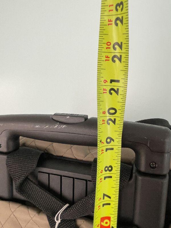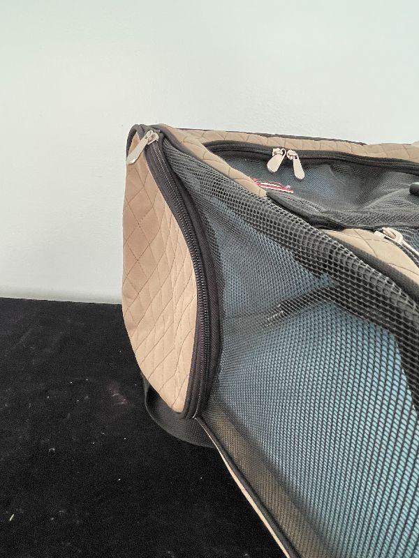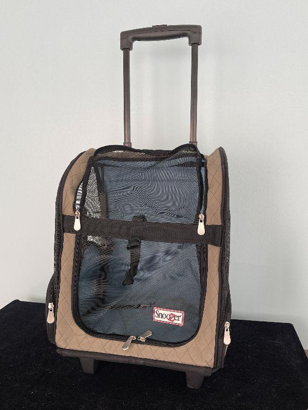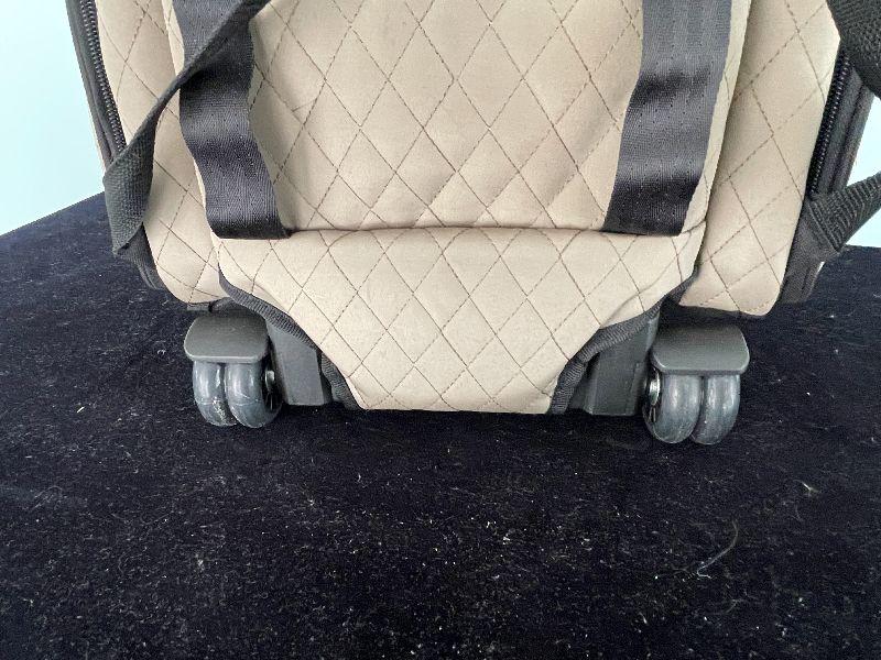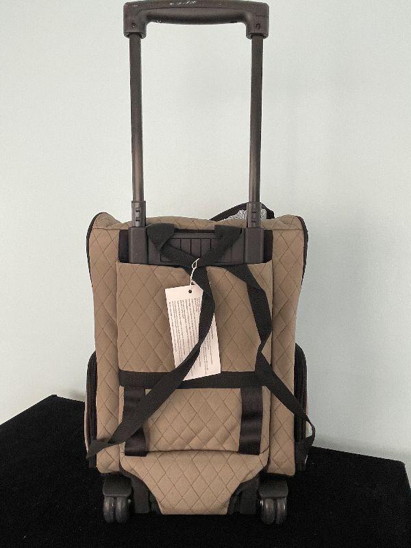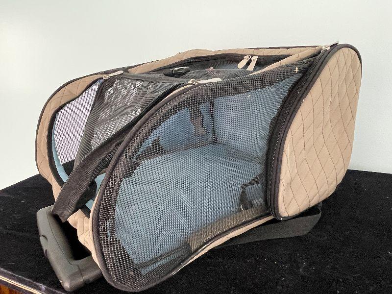 Great for traveling with small pets. Fits under an airplane seat. Rolls with handle.