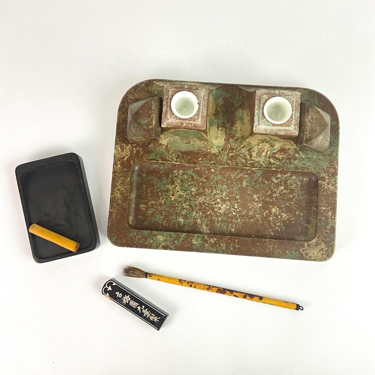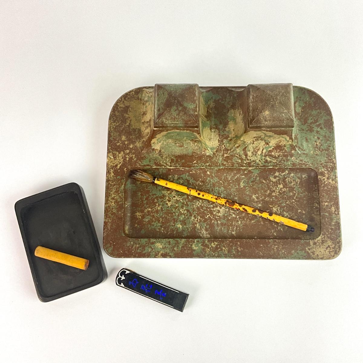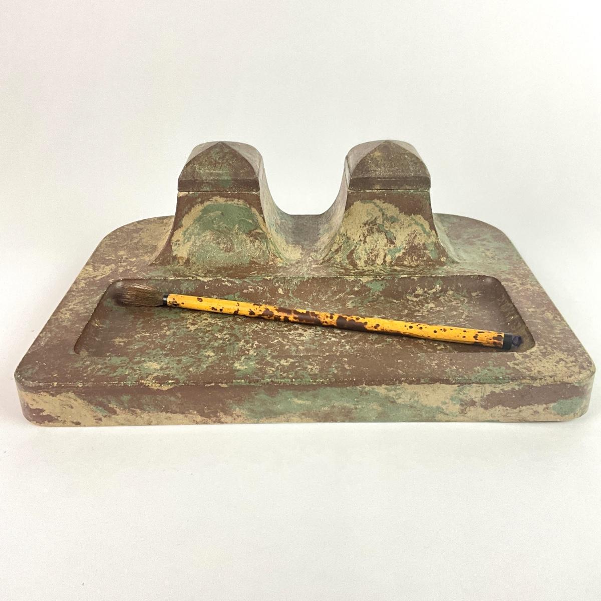 L155 Antique Marble & Granite Inkwell with Chinese Brush & Calligraphy Tool