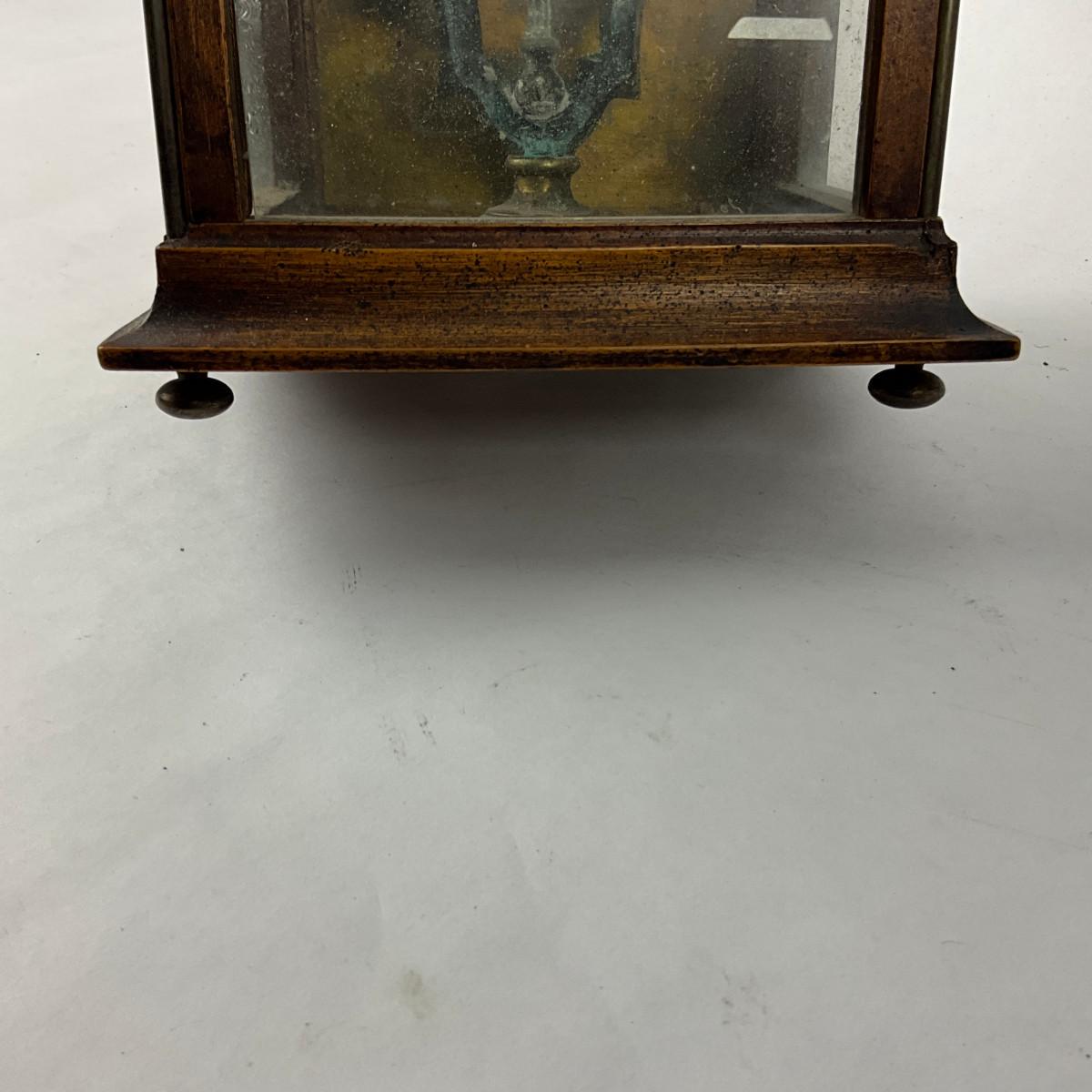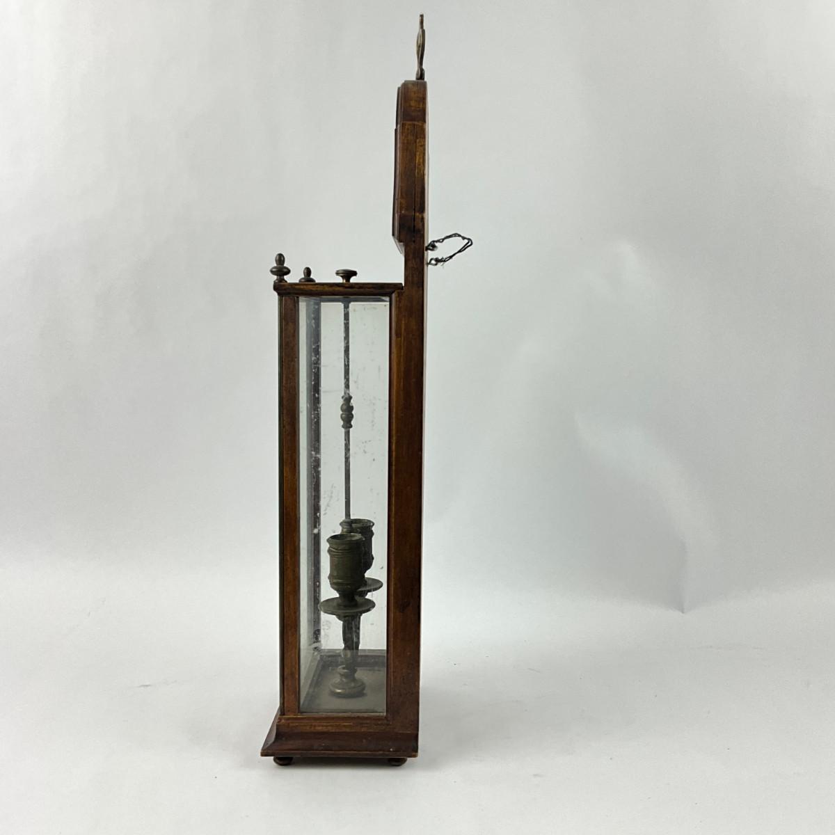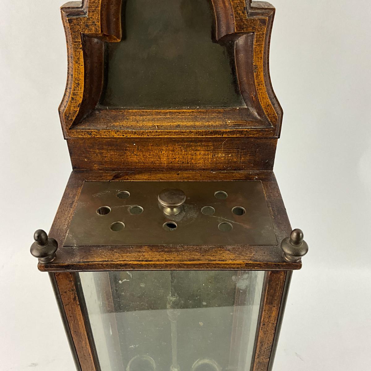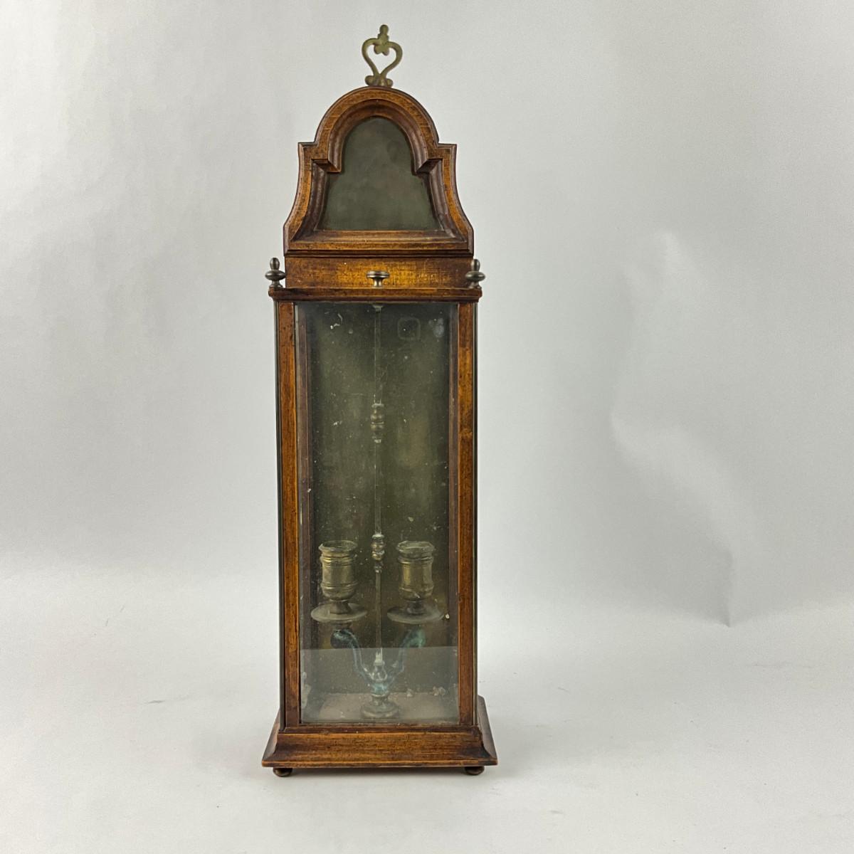 Brass and wood with double candlestick base surrounded by glass (three sides), brass feet