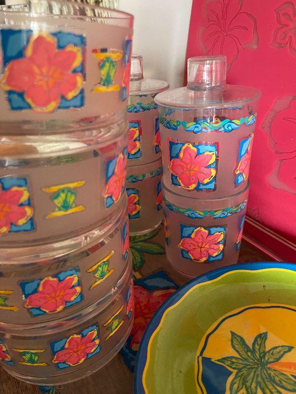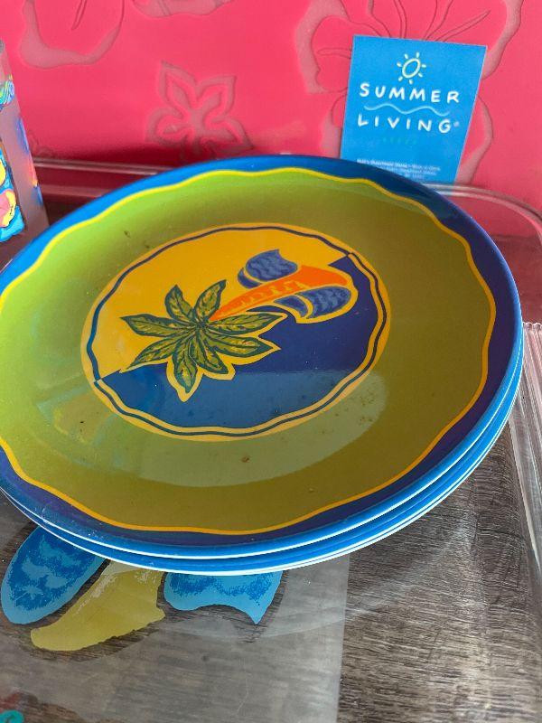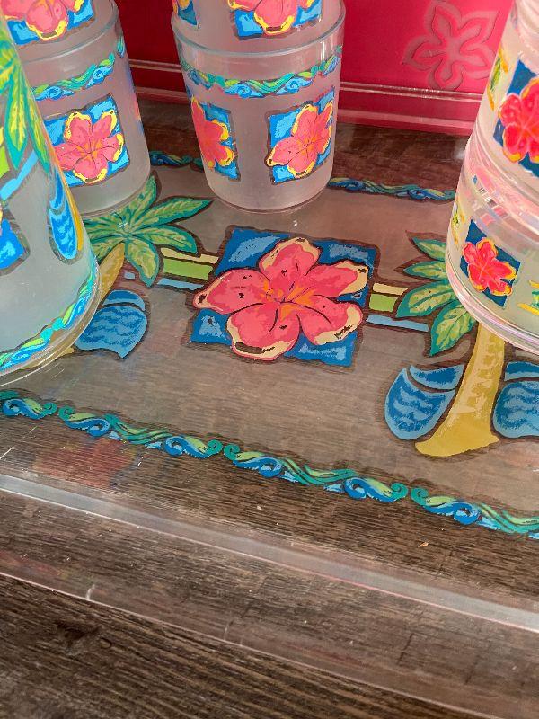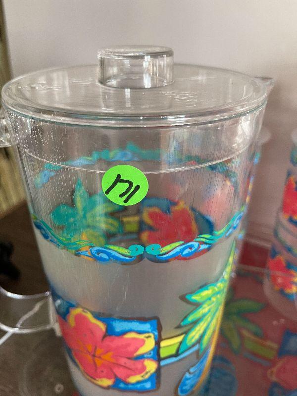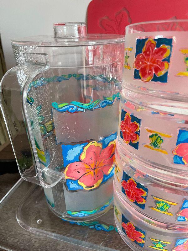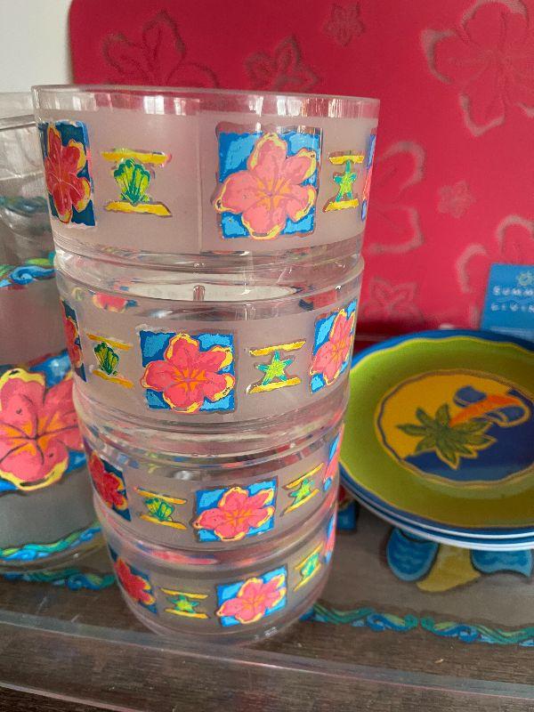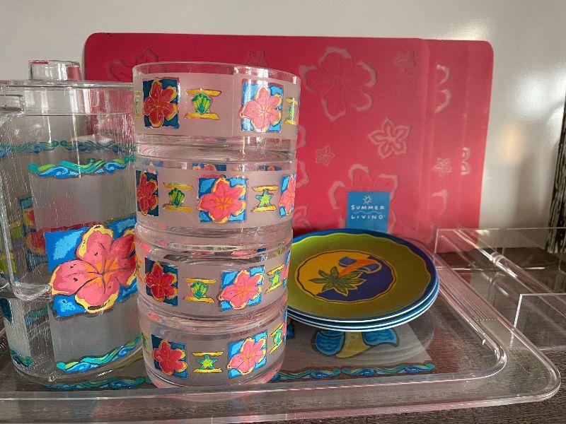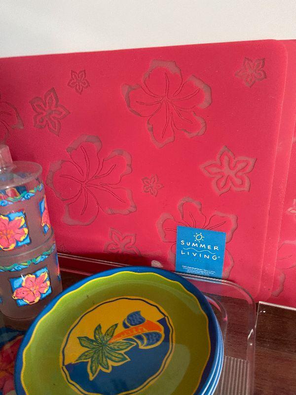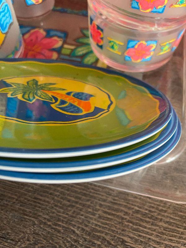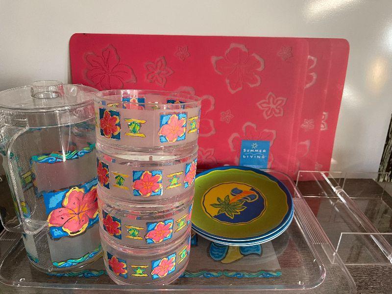 Four cups, three plates, four placemats, tray, pitcher, and napkins holder. Please see pictures for condition and measurements if taken. All items are sold as found and if furniture, you will need to be able to move yourself. Thank you for looking and have fun bidding! As always, thank you for being a Treasure Me Hunter!