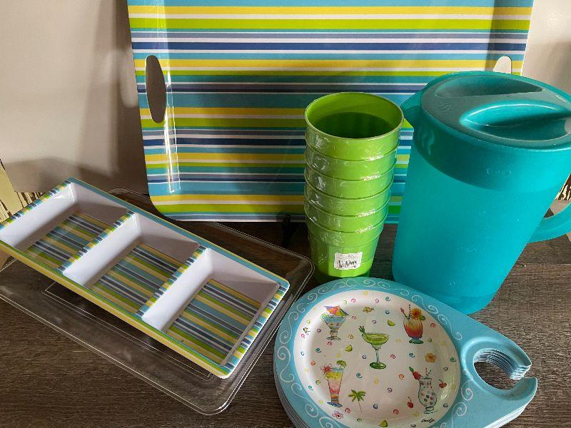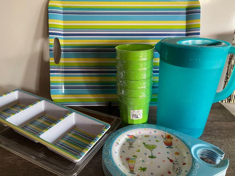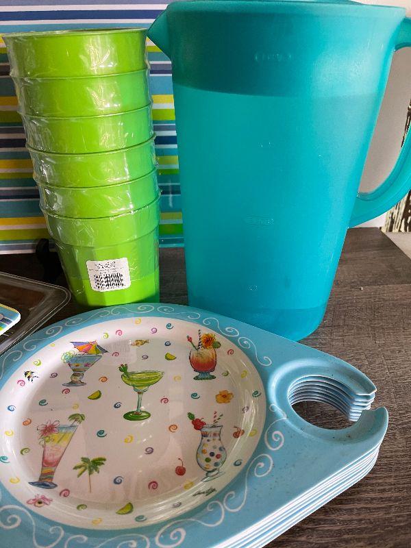 Matching cups, pitcher and serving platter. Please see pictures for condition and measurements if taken. All items are sold as found and if furniture, you will need to be able to move yourself. Thank you for looking and have fun bidding! As always, thank you for being a Treasure Me Hunter!