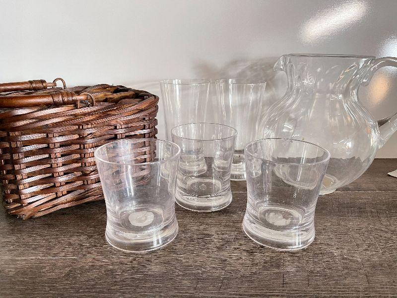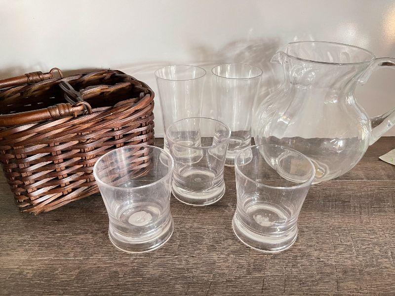 Plastic pitcher and cups. Silverware basket. Please see pictures for condition and measurements if taken. All items are sold as found and if furniture, you will need to be able to move yourself. Thank you for looking and have fun bidding! As always, thank you for being a Treasure Me Hunter!