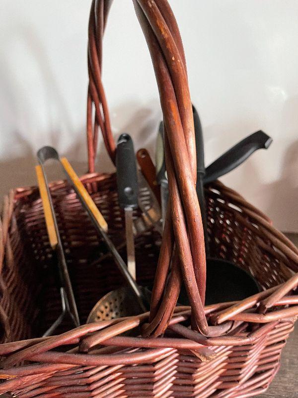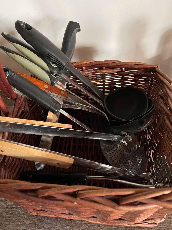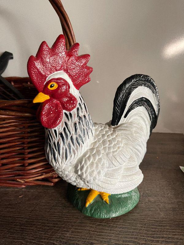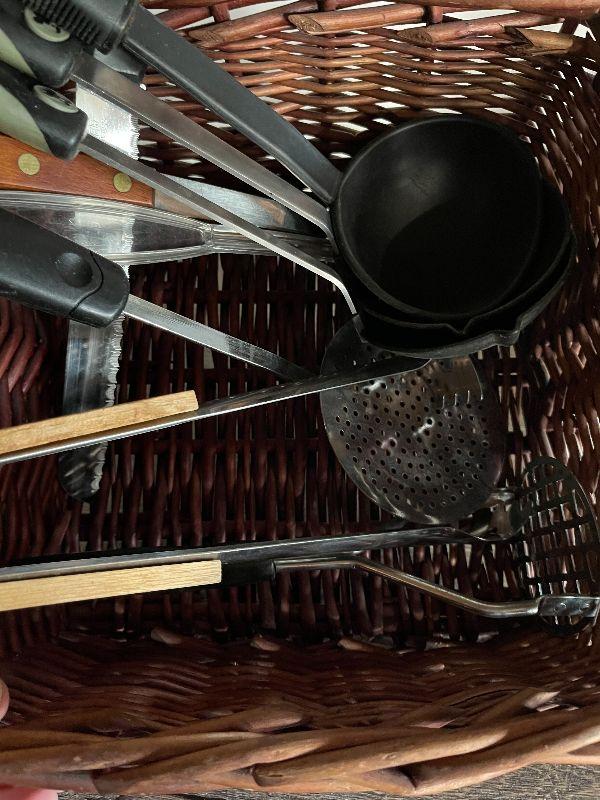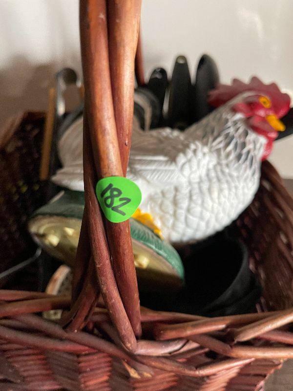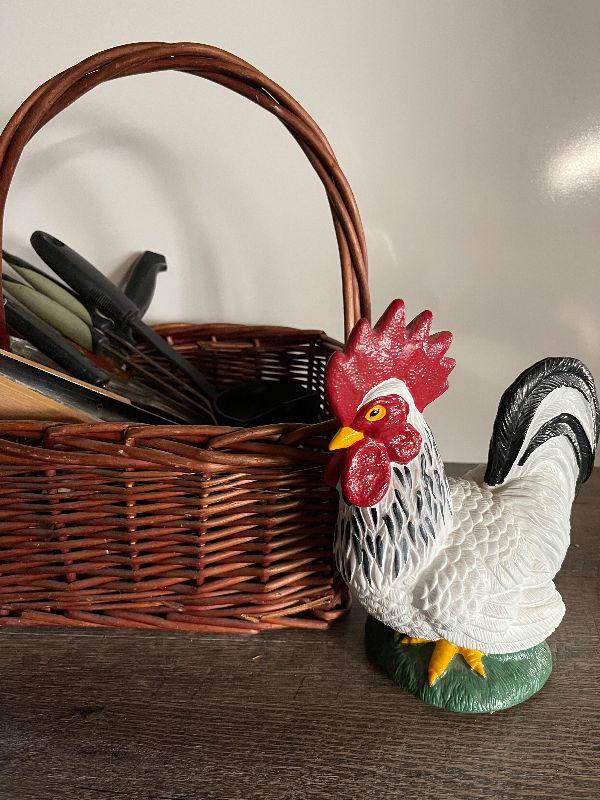 Battery operated plastic rooster. Basket w handle and Grilling/serving utensils. Please see pictures for condition and measurements if taken. All items are sold as found and if furniture, you will need to be able to move yourself. Thank you for looking and have fun bidding! As always, thank you for being a Treasure Me Hunter!
