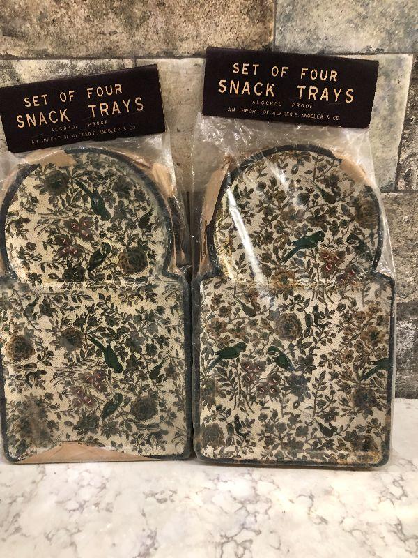 These vintage serving pieces are an import of Alfred E. Knobler & Co. Paper mache. Alcohol proof with birds and floral motif. Please see all pictures for condition and measurements if taken. All items are sold as found and if furniture, you will need to be able to move yourself. Thank you for looking and have fun bidding! As always, thank you for being a Treasure Me Hunter!