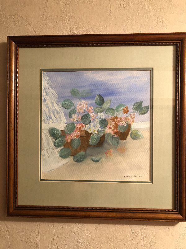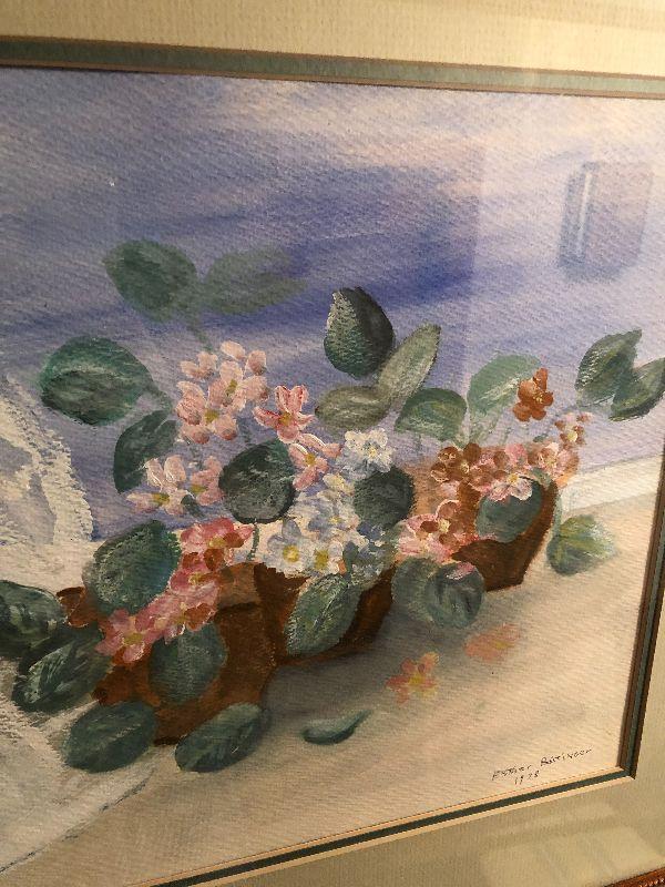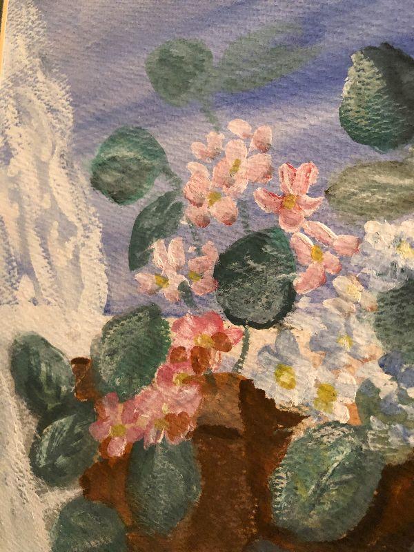 This lovely painting looks to be acrylics or watercolors. Please see all pictures for contents of the lot, condition of the items in the lot, and measurements if taken. Thank you for looking and have fun bidding.