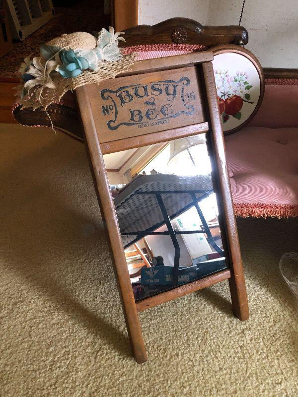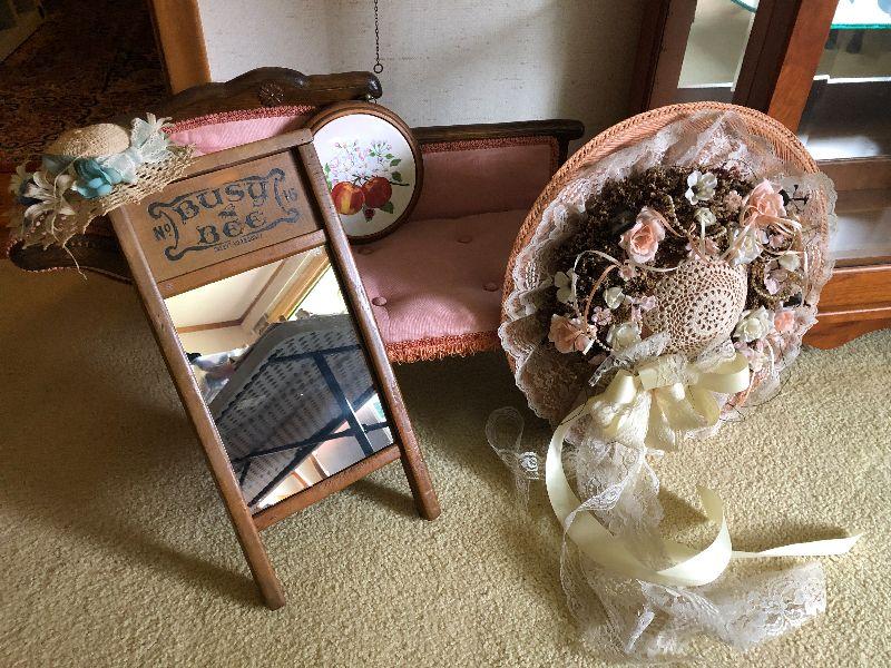 L199: Doll Chaise, Mini Washboard, and Floral Hats