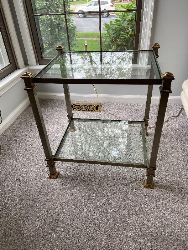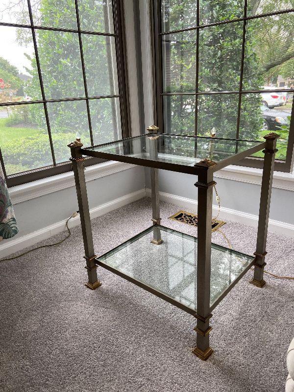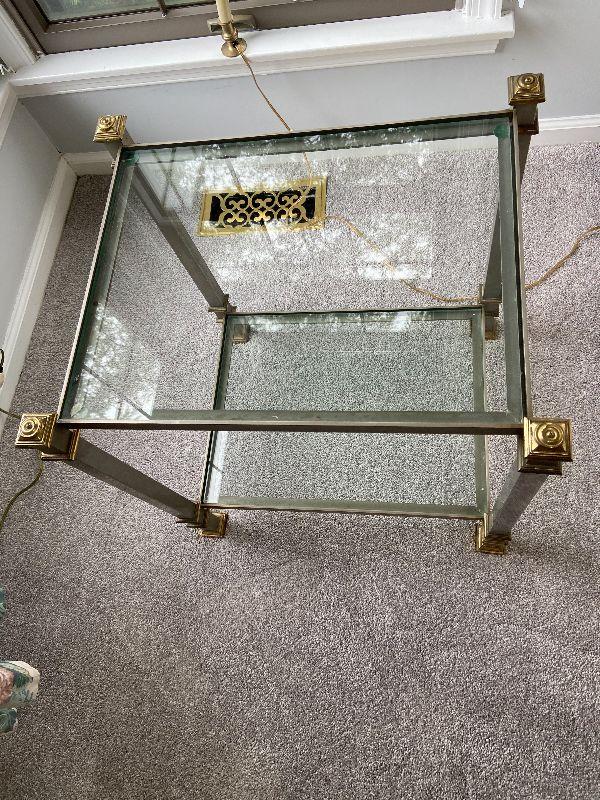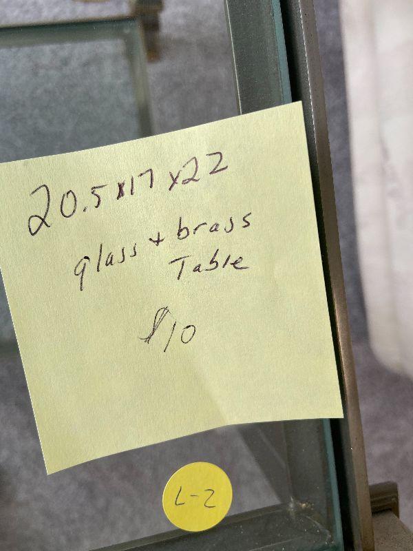 Metal and Glass 2-Tier Side table. Please see all pictures for contents in this listing, the condition of items in the listing, and the size if measurements were taken. Thank you for looking and have fun bidding.