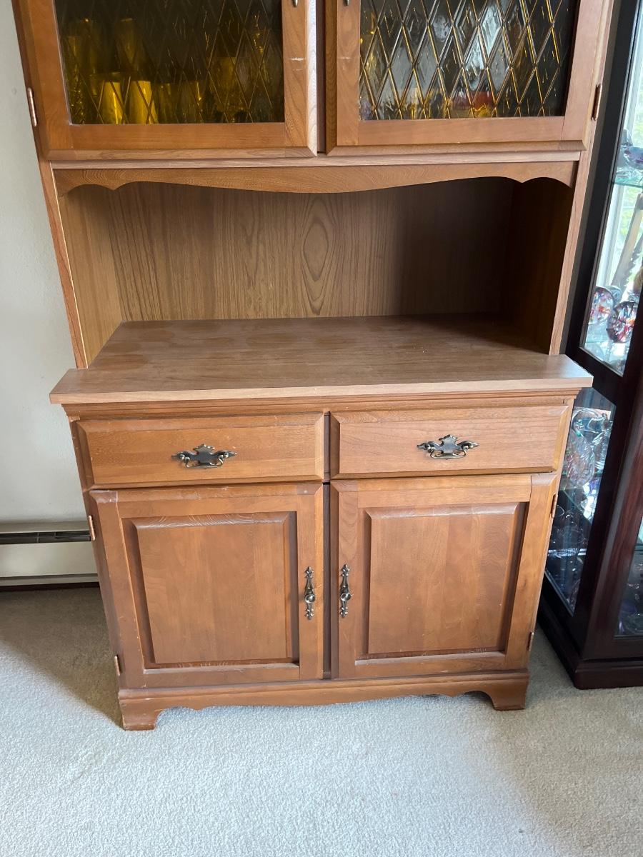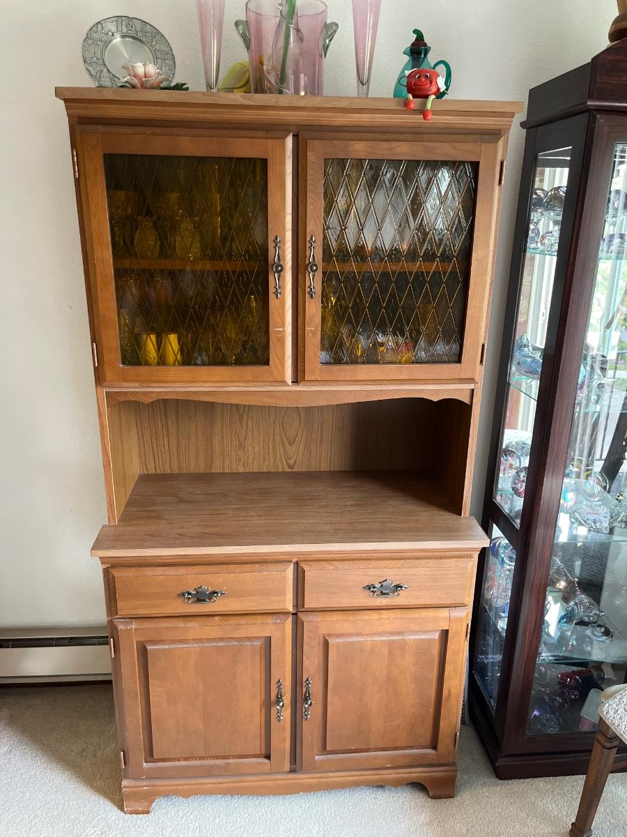 Very cute! 36”w x 17”d x 69”h. Cute stain glass-look doors. Contents not included
