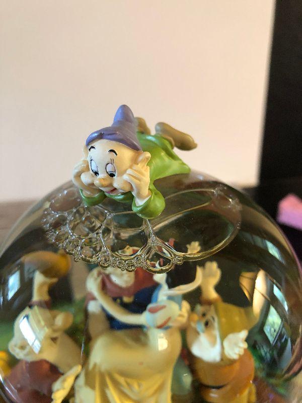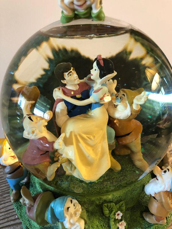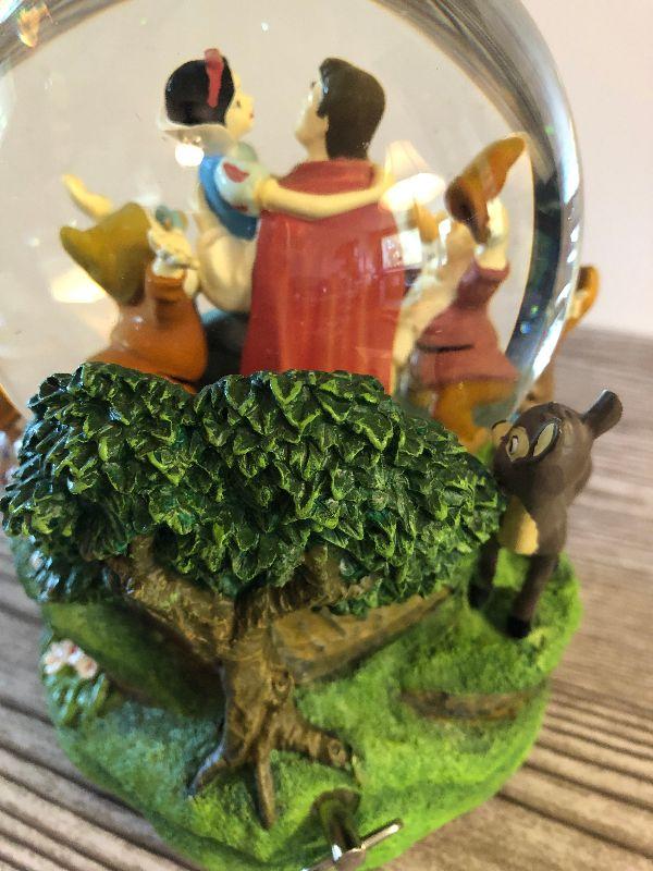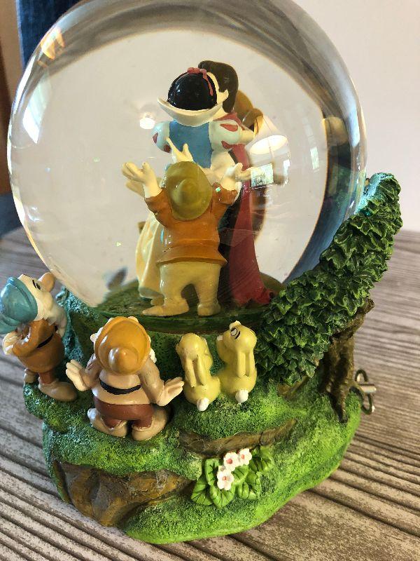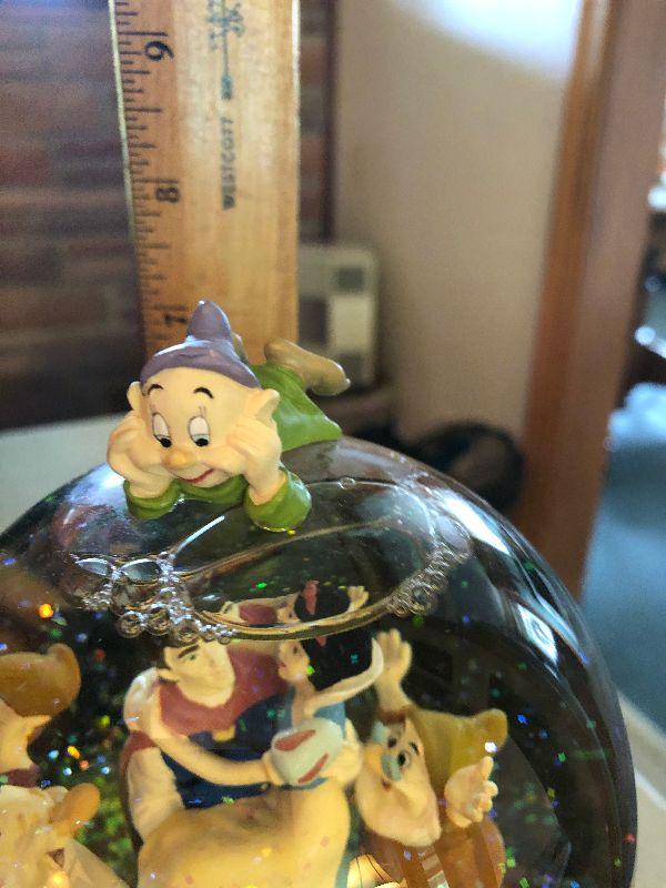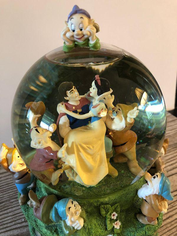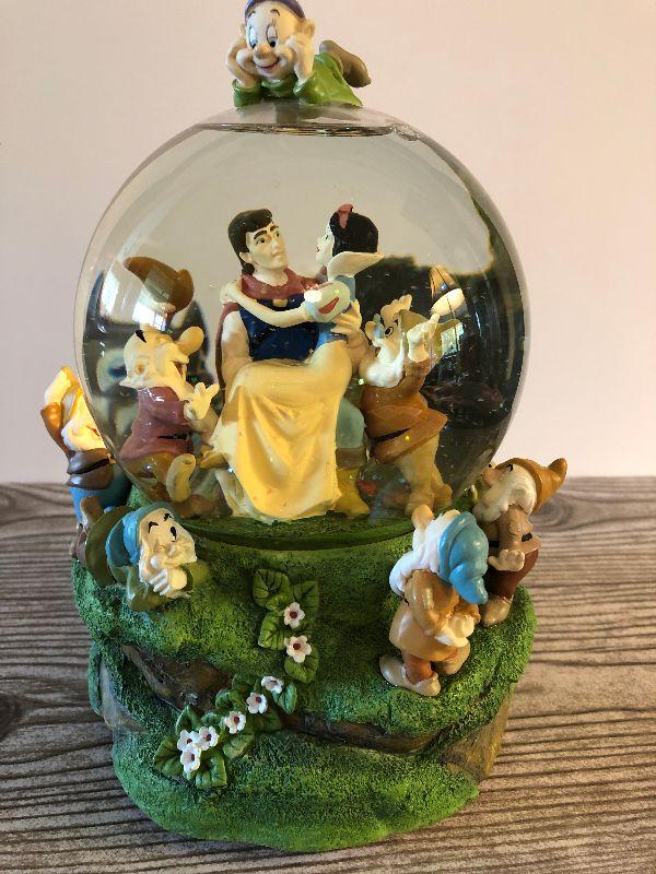 Snow White and the Seven Dwarfs musical snow globe from the Disney Store.. Please see all pictures for contents of the lot, the condition of items in the lot, and measurements of the items if taken. Thank you for looking and have fun bidding.