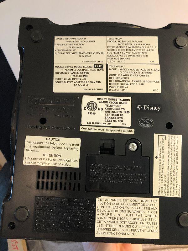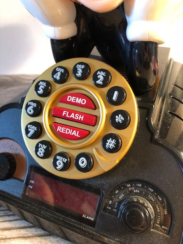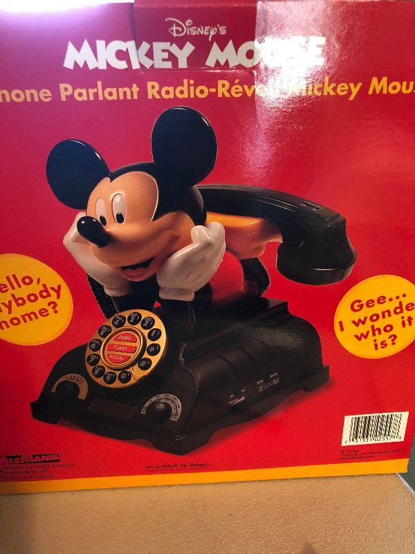Mickey Mouse talking alarm clock, radio, telephone. Please see all pictures for contents of the lot, the condition of items in the lot, and measurements of the items if taken. Thank you for looking and have fun bidding.