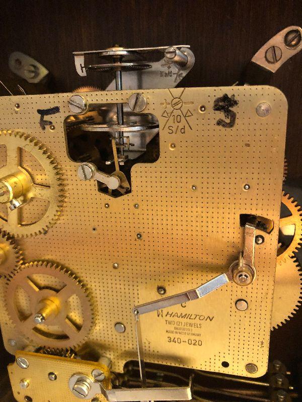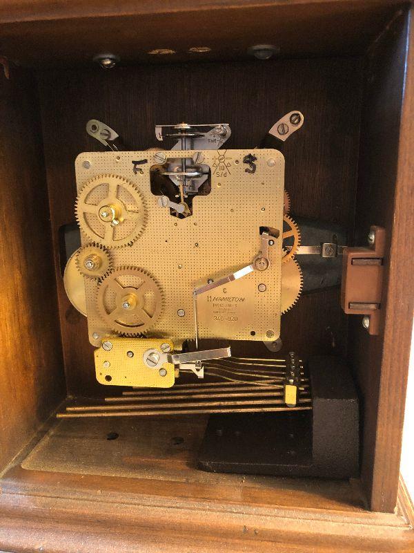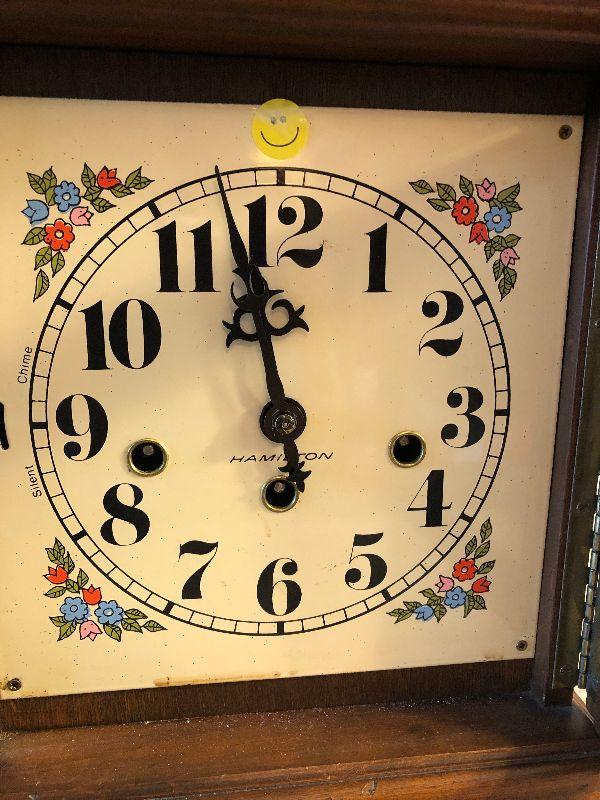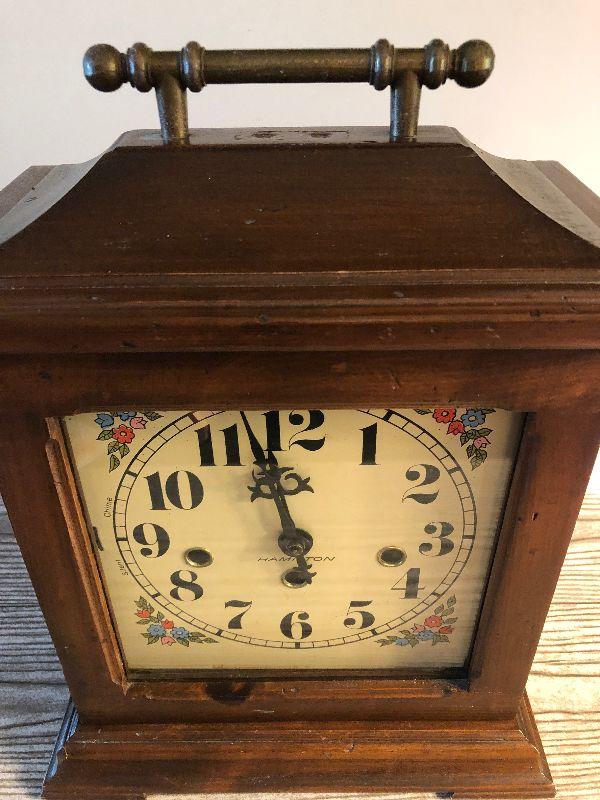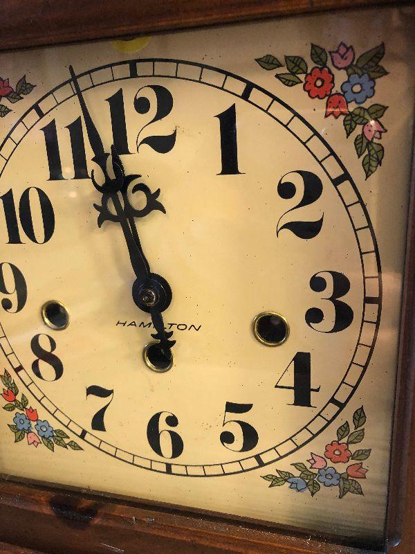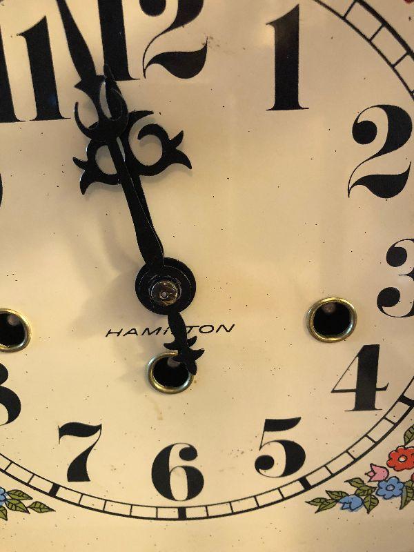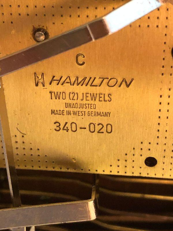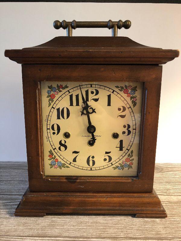 Hamilton Two Jewel Clock. Untested. Please see all pictures for contents of the lot, the condition of items in the lot, and measurements of the items if taken. Thank you for looking and have fun bidding.