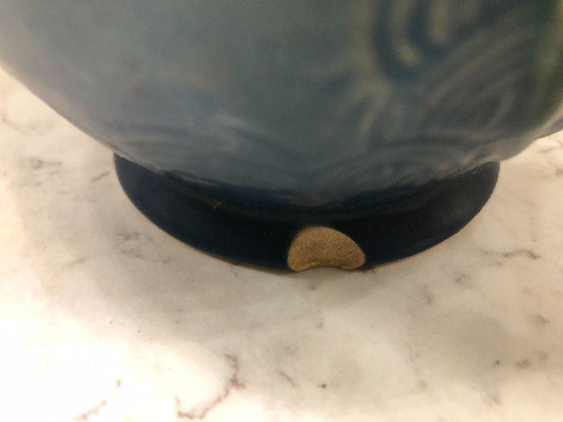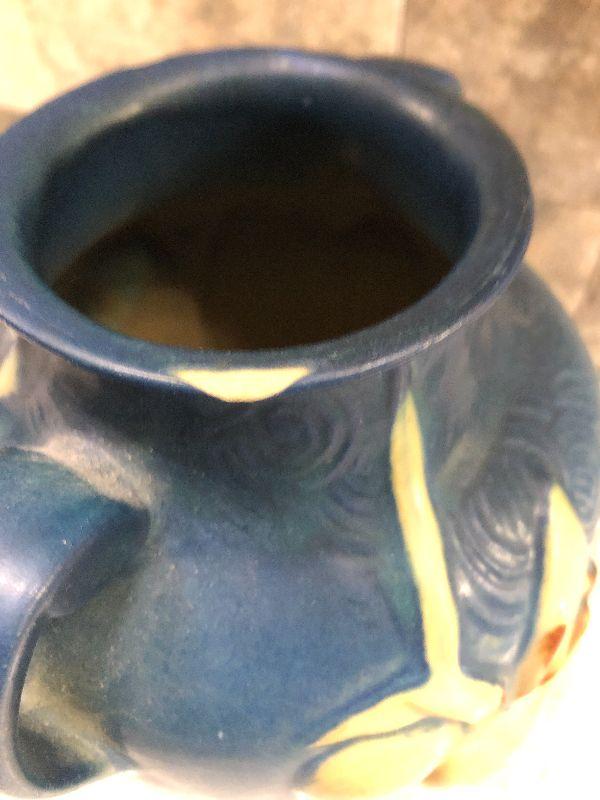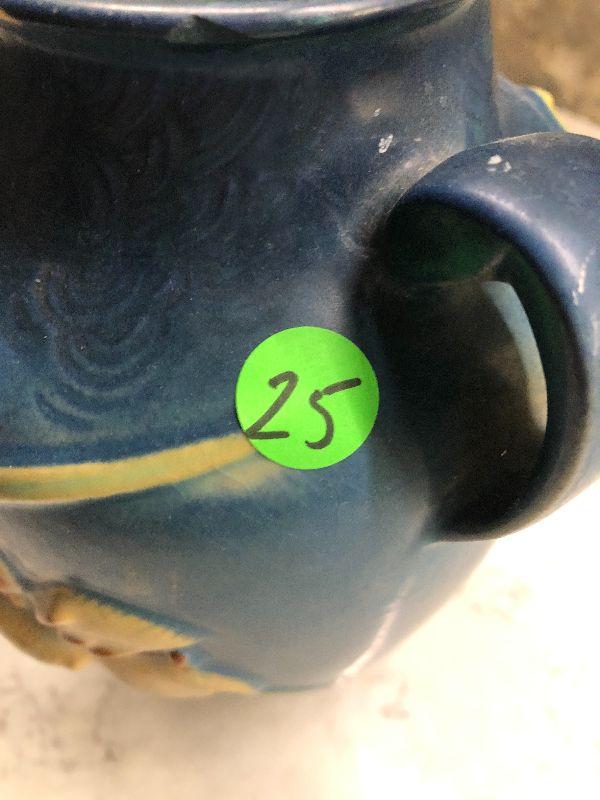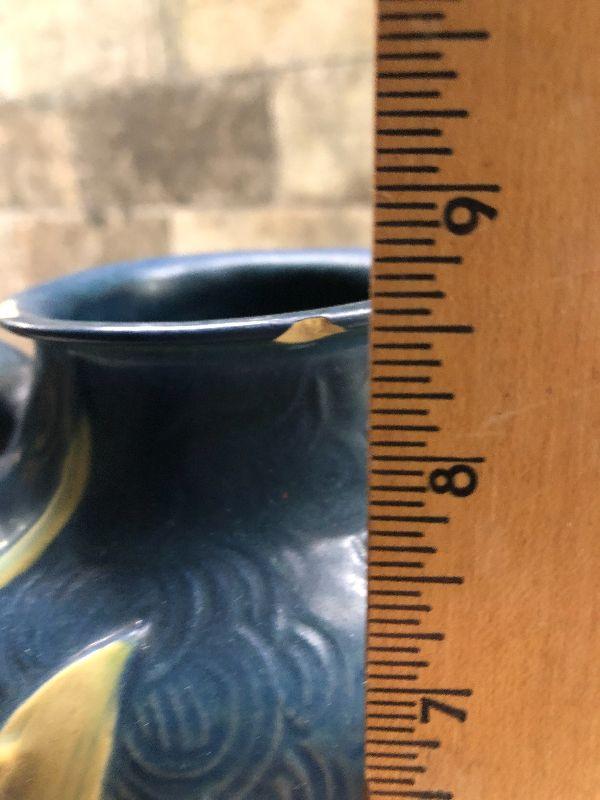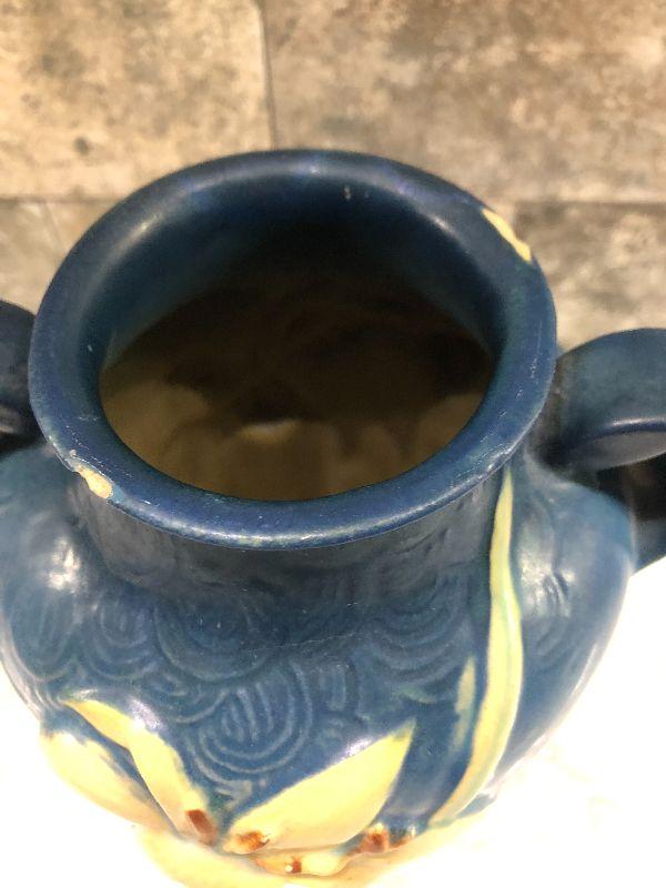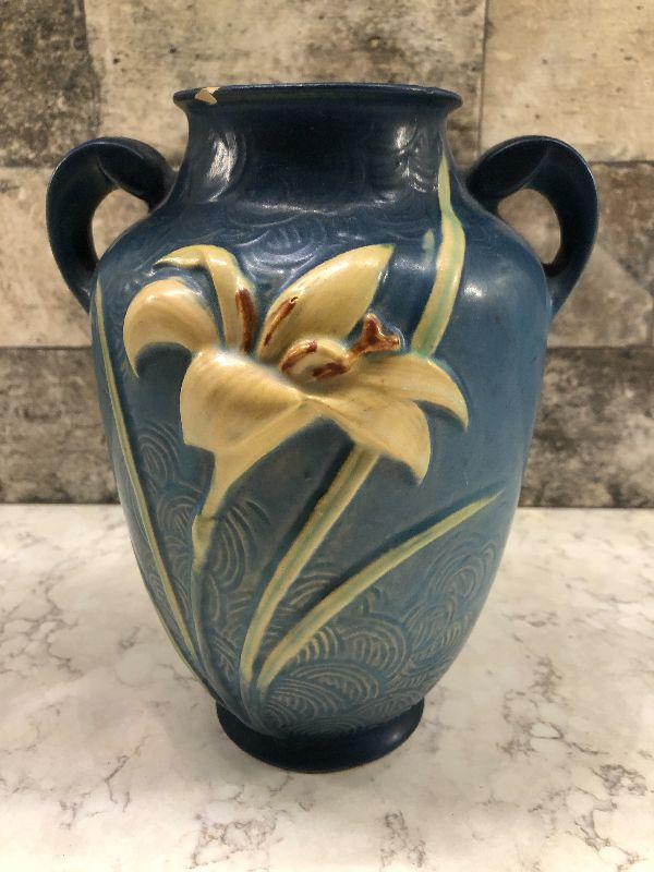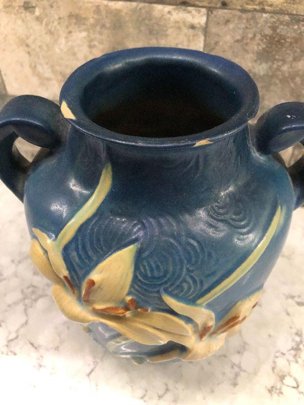 Vintage pottery. Blue with Zephyr Lily. 9" Tall Vase as is. This does have some cracks at the rim. Please see all pictures for condition and measurements if taken. All items are sold as found and if furniture, you will need to be able to move yourself. Thank you for looking and have fun bidding! As always, thank you for being a Treasure Me Hunter!