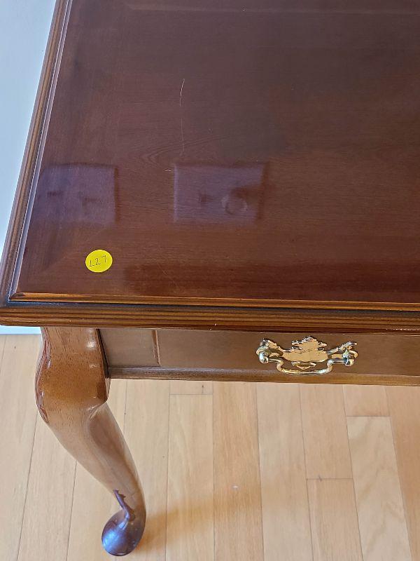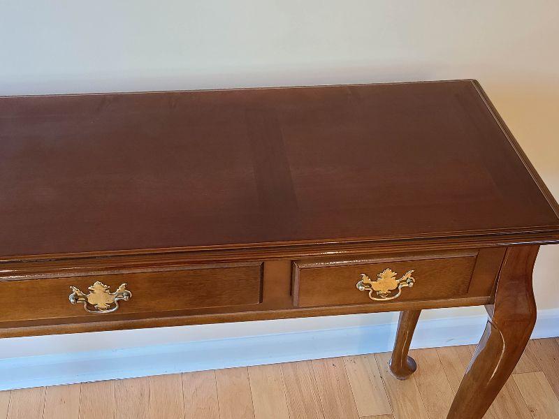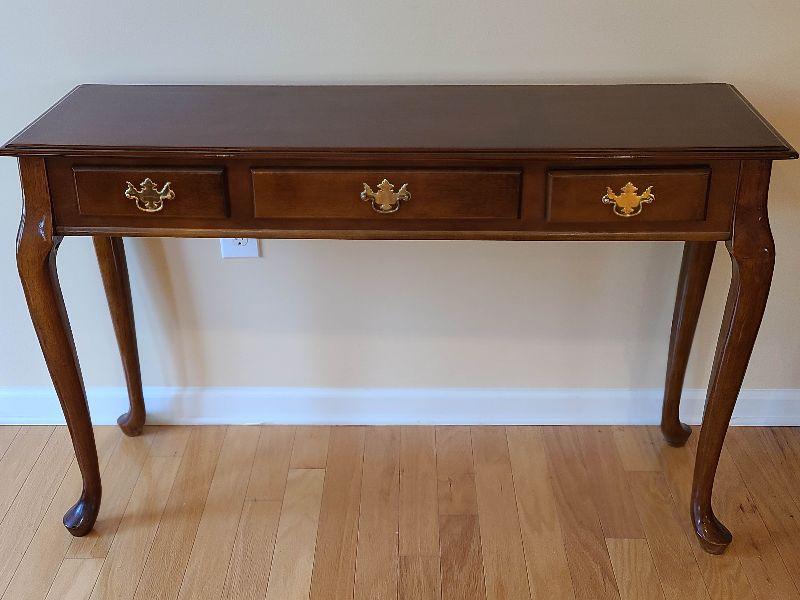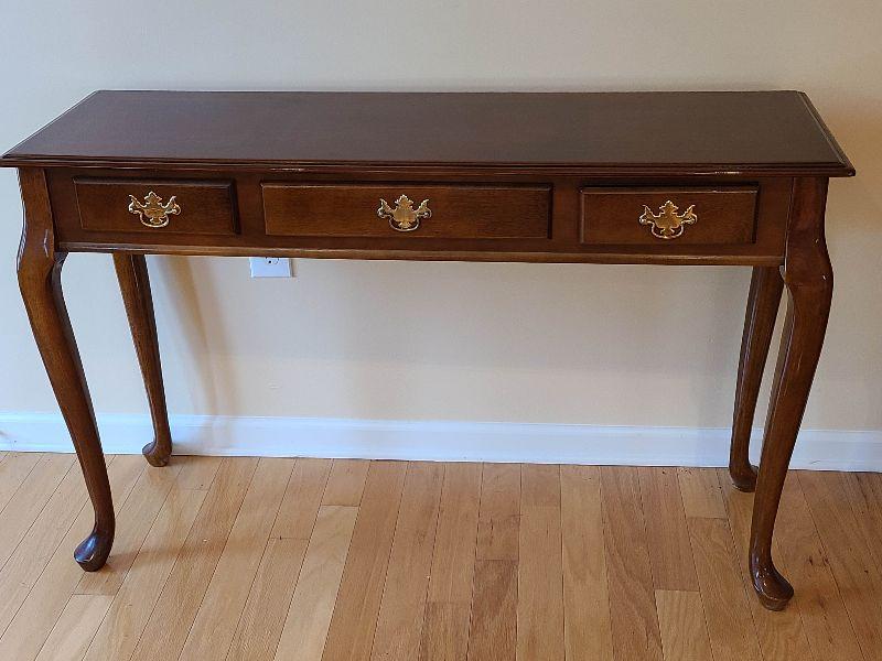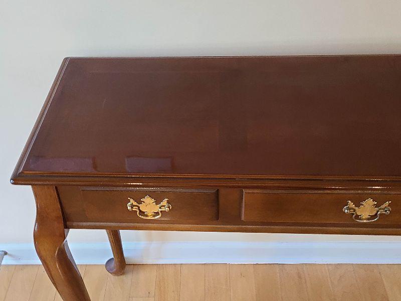 Sofa table high gloss, with minimal wear. Please see pictures for contents of the lot, condition of the lot, and any measurements of the item. Thank you for looking and happy bidding!