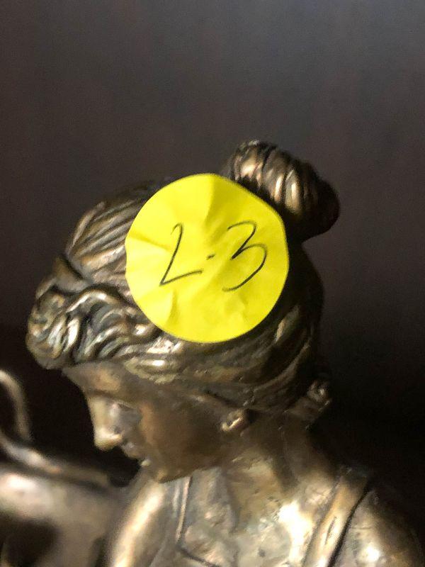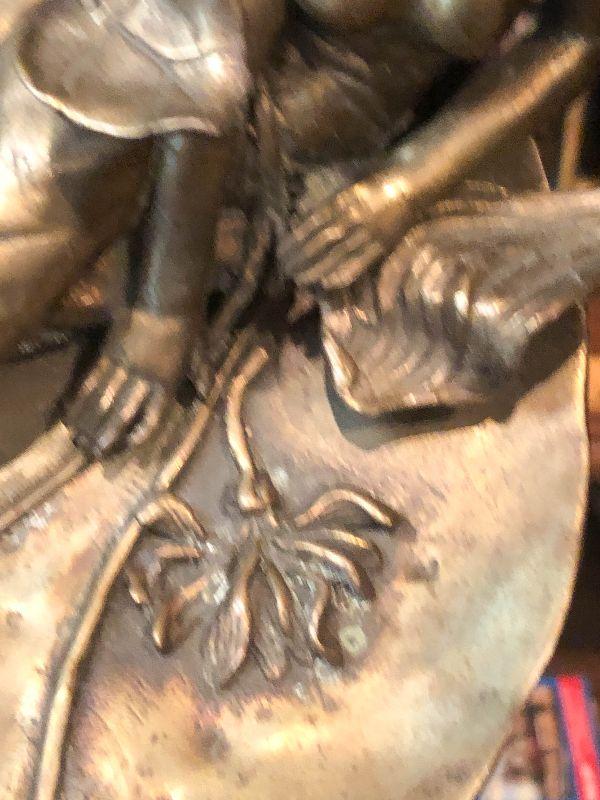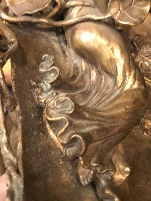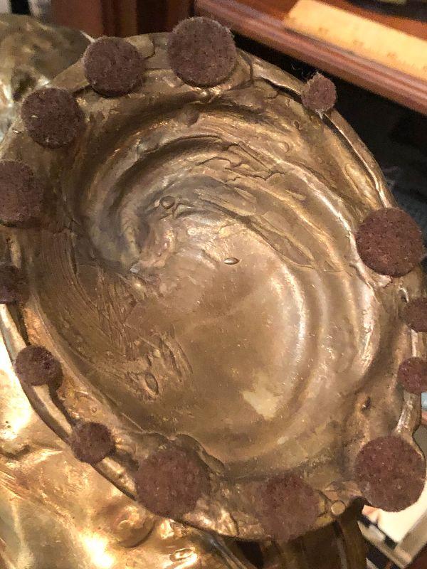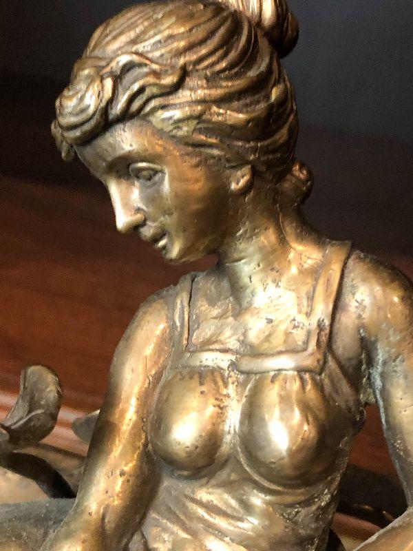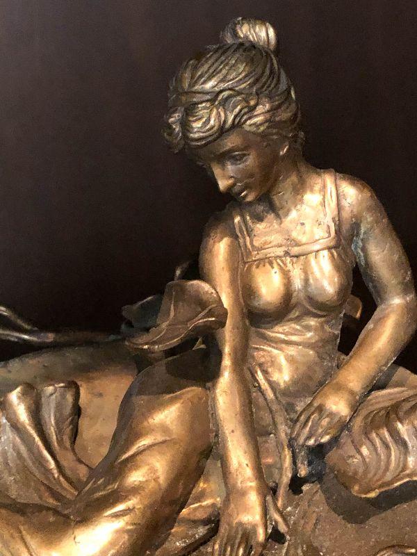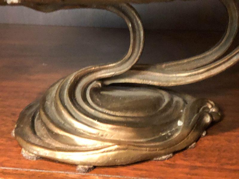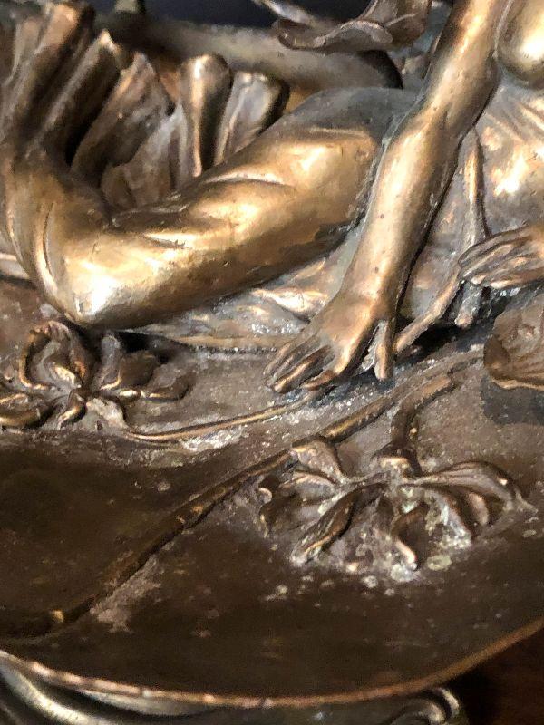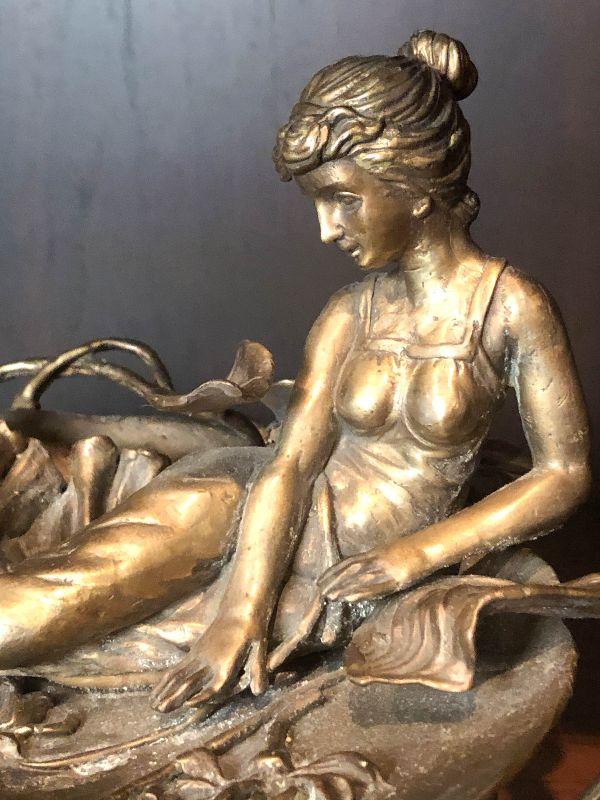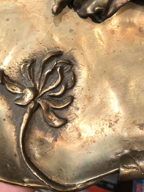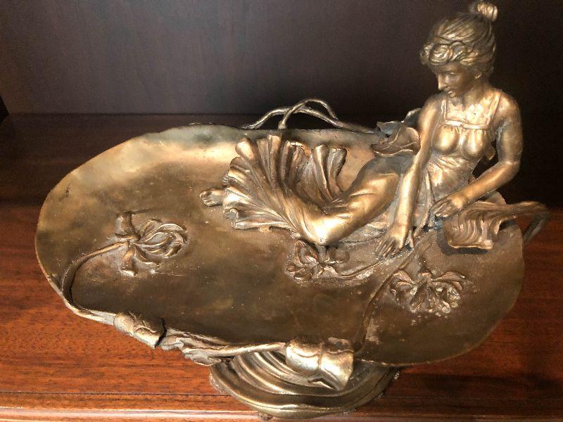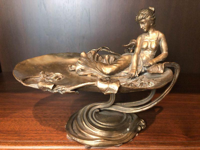 This is a gorgeous piece and is larger than appears in pictures. This art nouveau inspired piece stand around 10 inches long and nine inches high. Daydreaming woman on lake or lily pad, sweeping lines holding this in the air. Artistic piece for any room, and functional as a vanity stand as well. Please see all of the pictures for size, and condition. Not signed. Not sure of composition, bronze or brass.