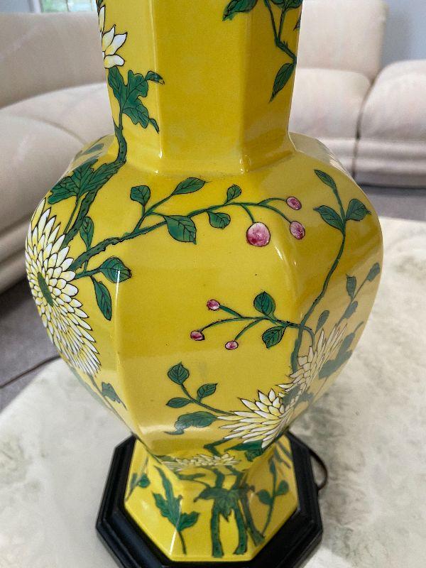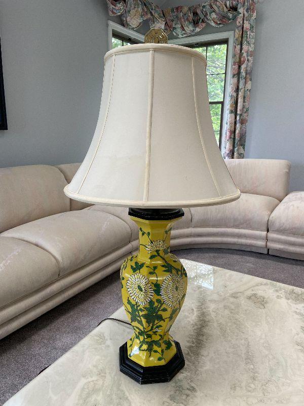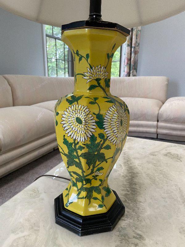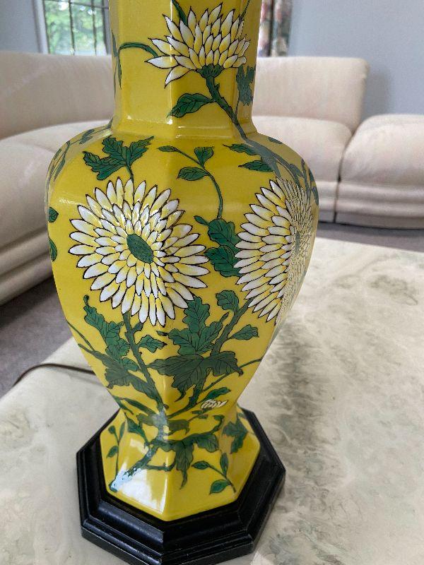 Bright yellow lamp with Yellow and Pink flowers and green leaves. Please see all pictures for contents in this listing, the condition of items in the listing, and the size if measurements were taken. Thank you for looking and have fun bidding.