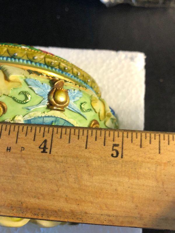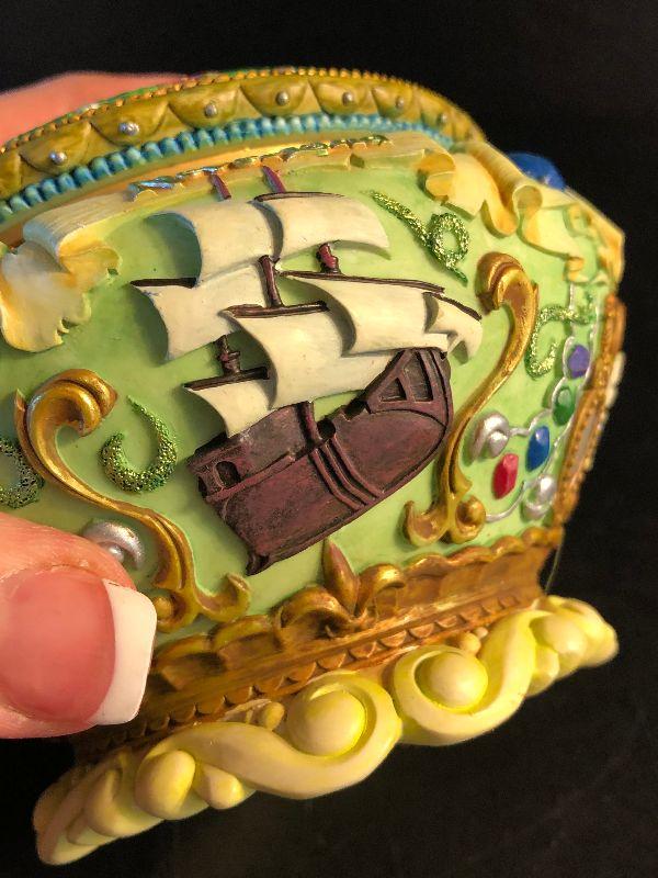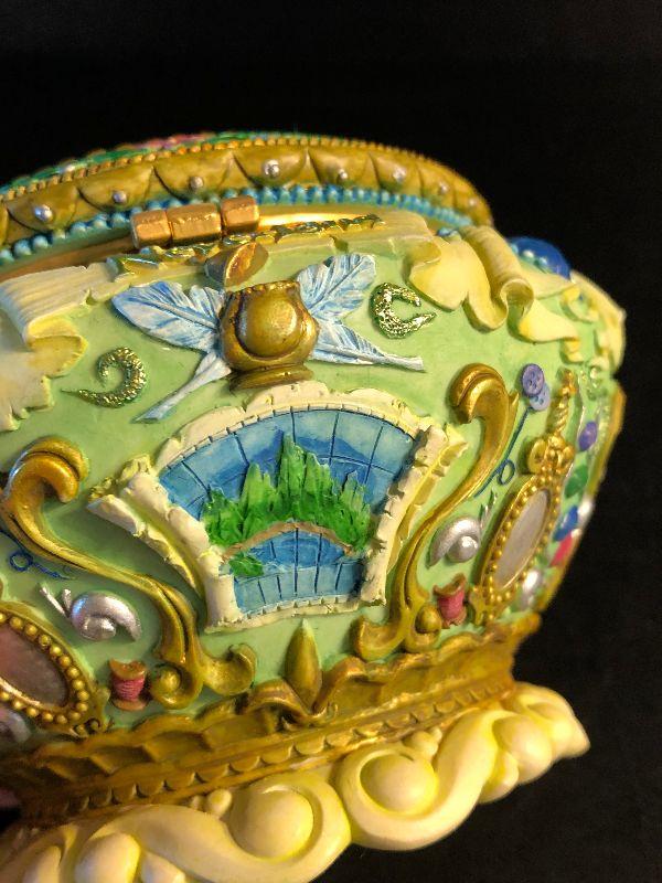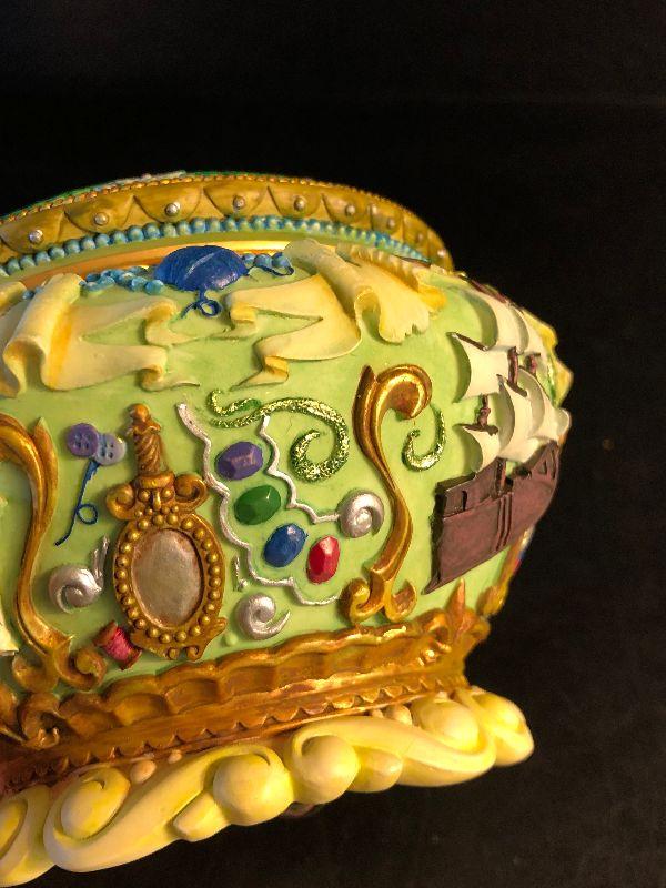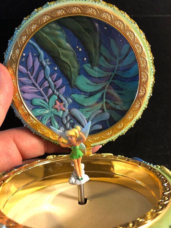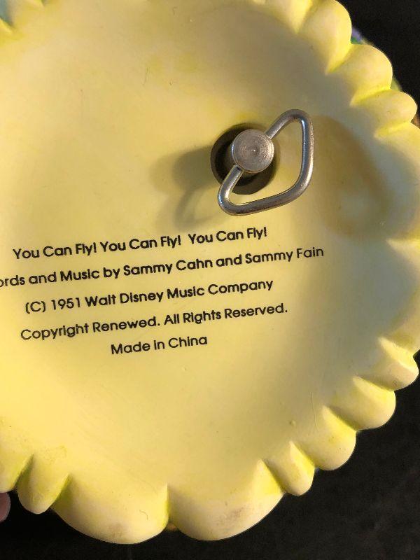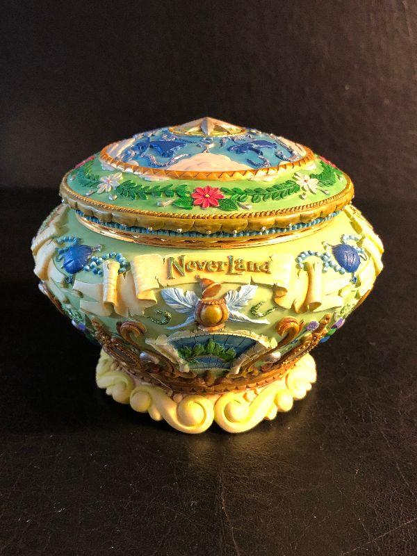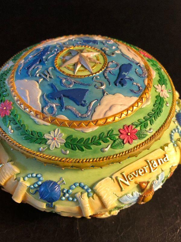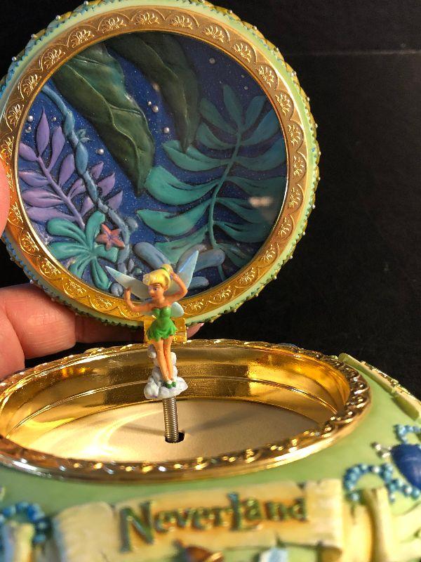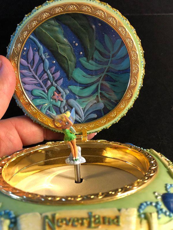 Music box plays "You can fly! You can fly". Ornate Peter Pan and Neverland detail. Please see all pictures for contents of the lot, the condition of items in the lot, and measurements of the items if taken. Thank you for looking and have fun bidding.