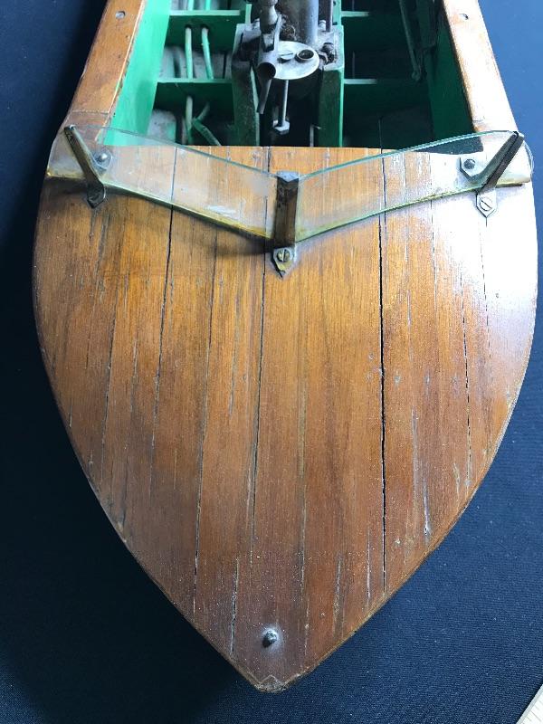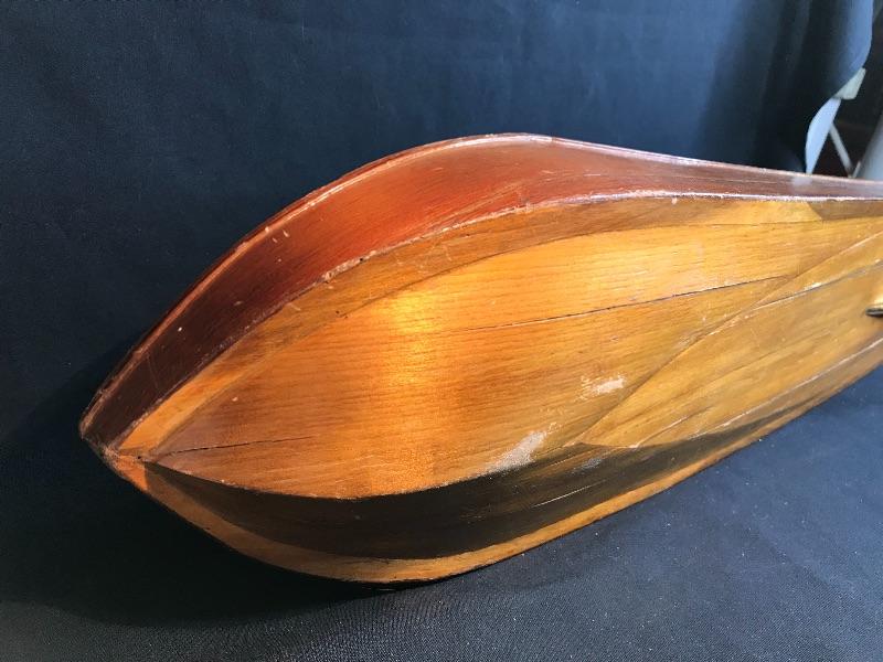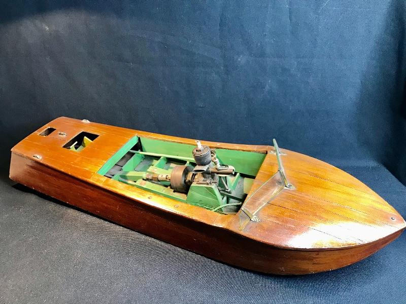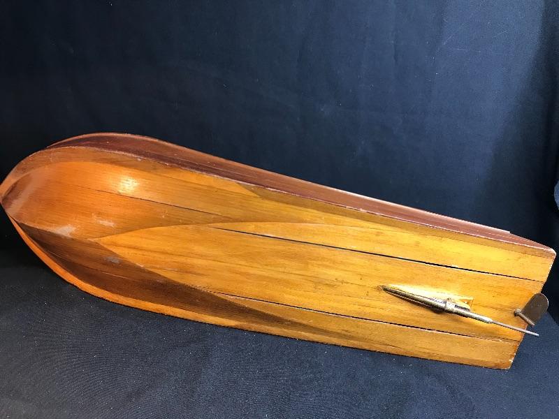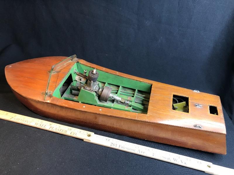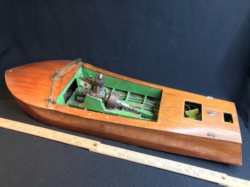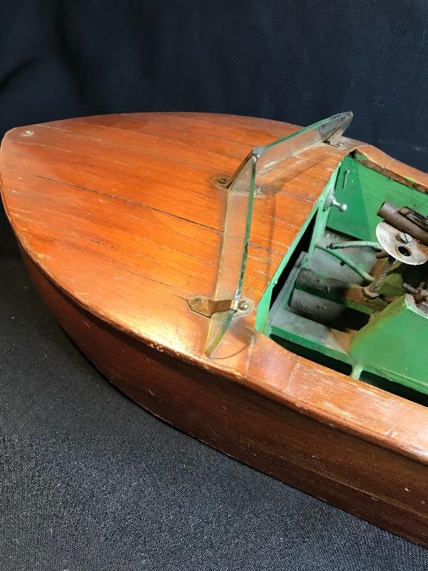 Handcrafted wooded boat with motor. Incredible piece to see in person. Fine antique model. This is untested and as-is. Please see all pictures for content of the lot, condition of the lot, and measurements if taken. Pictures are the best representation of the items listed and items are untested unless indicated in description. Thank you for looking and have fun bidding