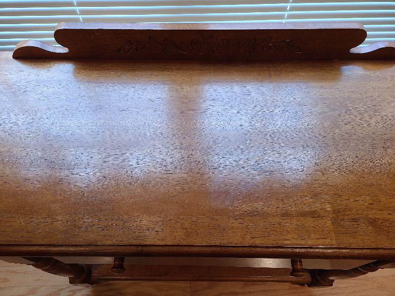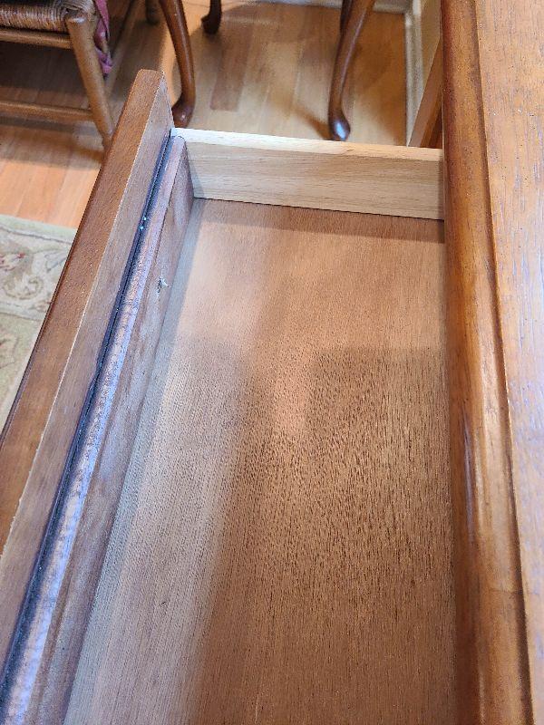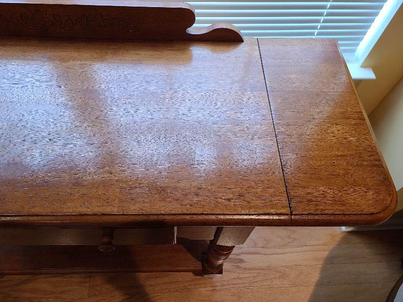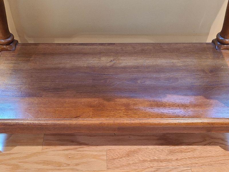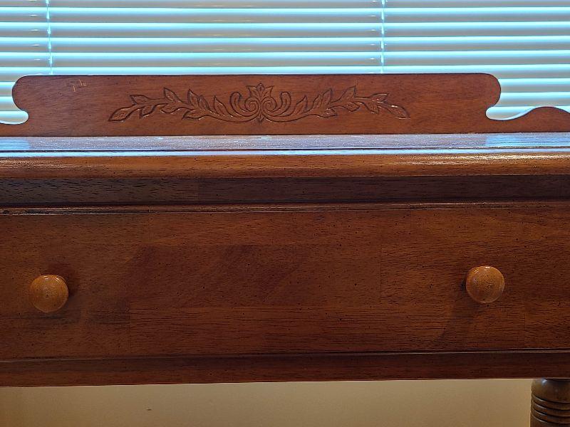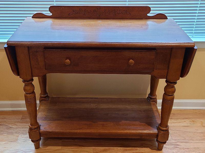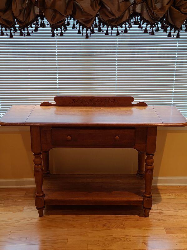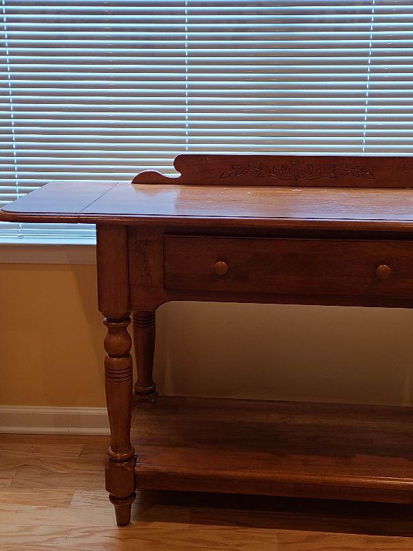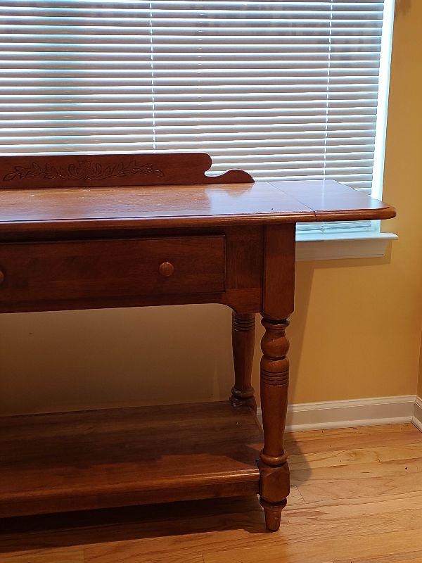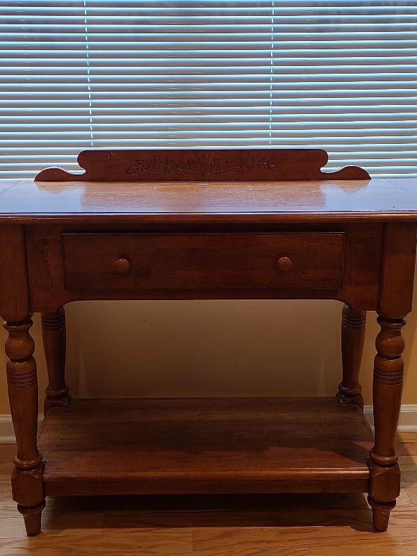 Solid Table perfect for any room. Can be used as entryway table for farmhouse decor, or as tv stand in any room. Please see pictures for contents of the lot, condition of the lot, and any measurements of the item. Thank you for looking and happy bidding!