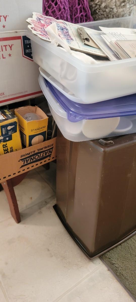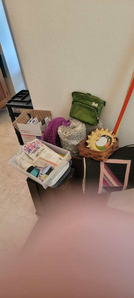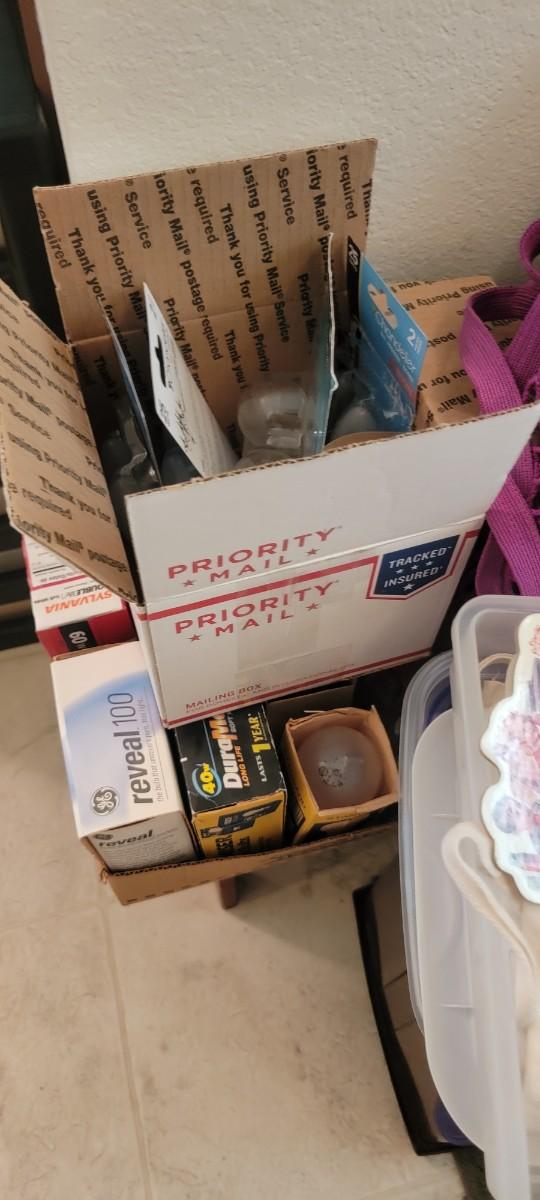 A little bit of everything! Light bulbs, refrigerator magnets, a green handbag, rug....