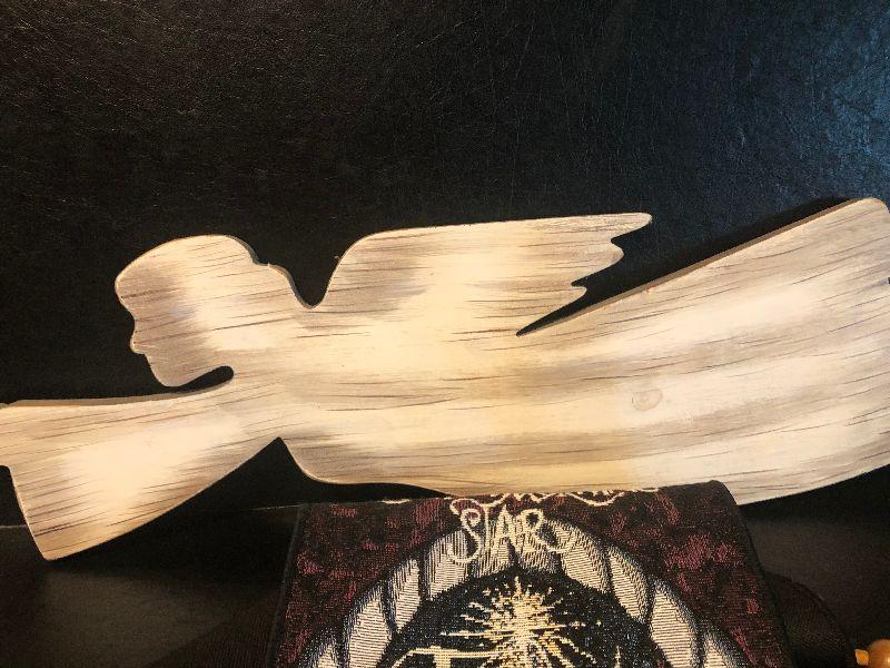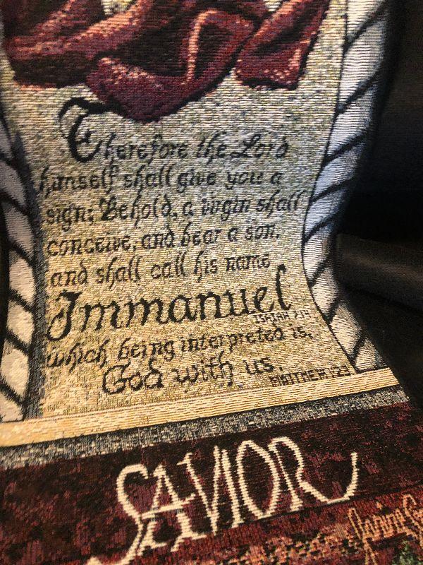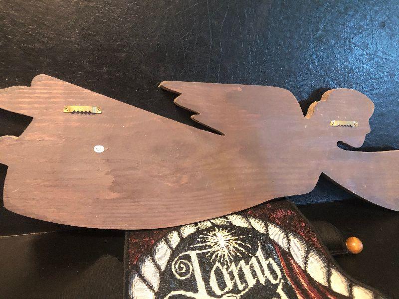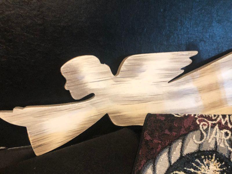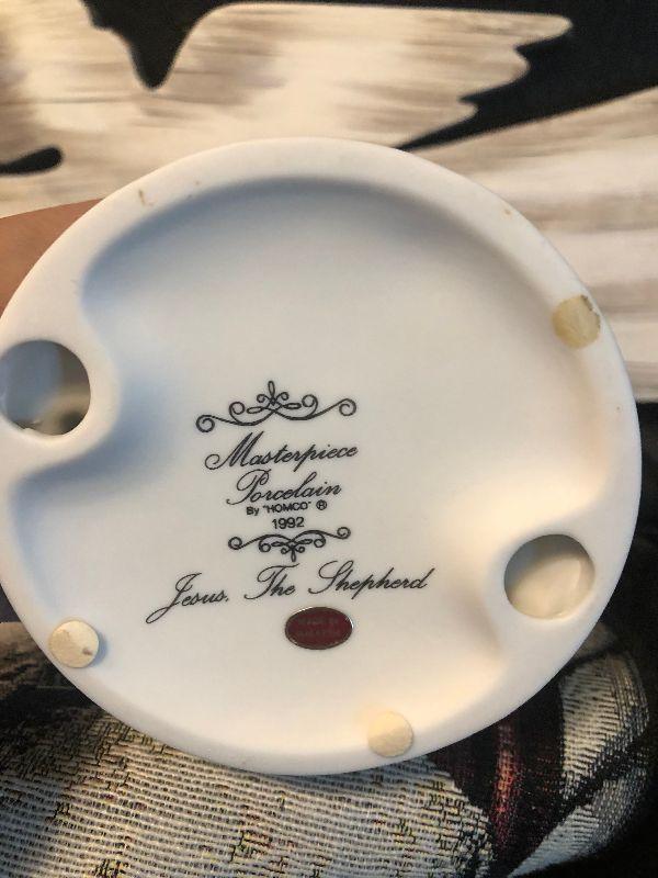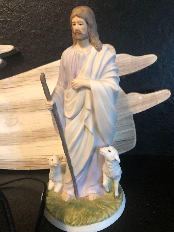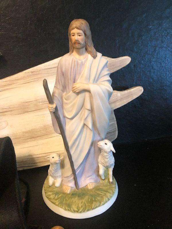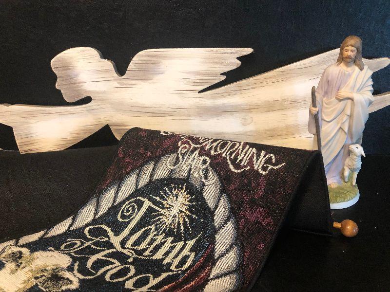 L43: Homco Jesus the Shepherd, wood angel and small tapestry