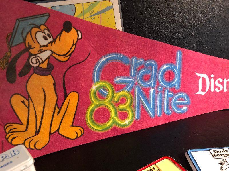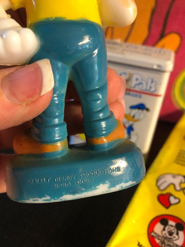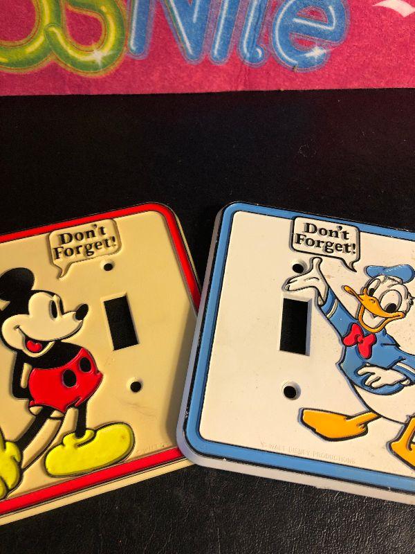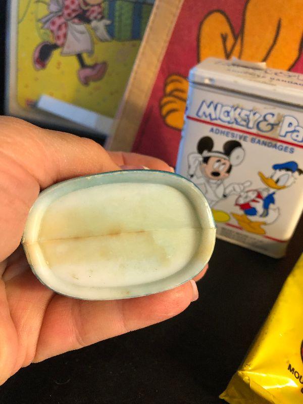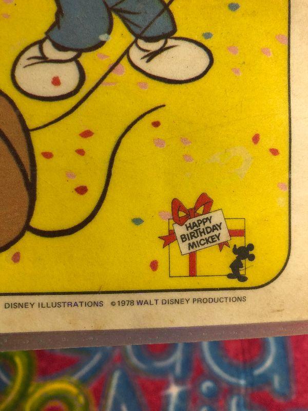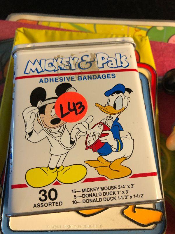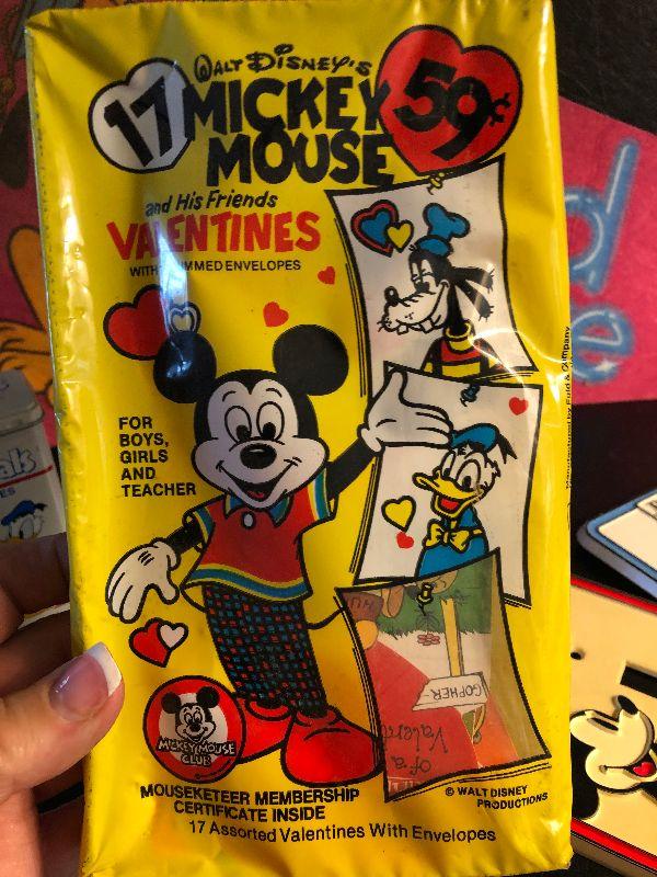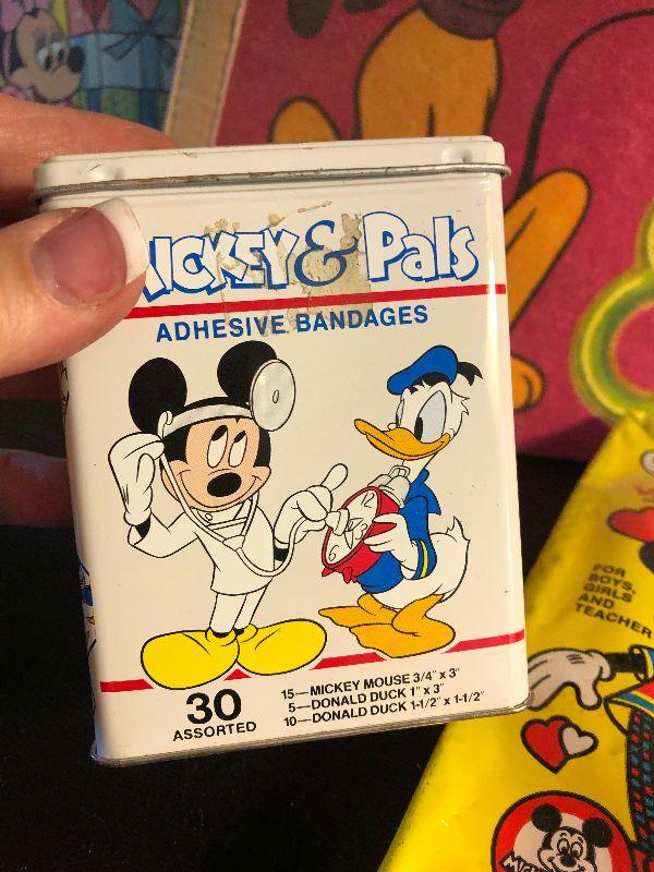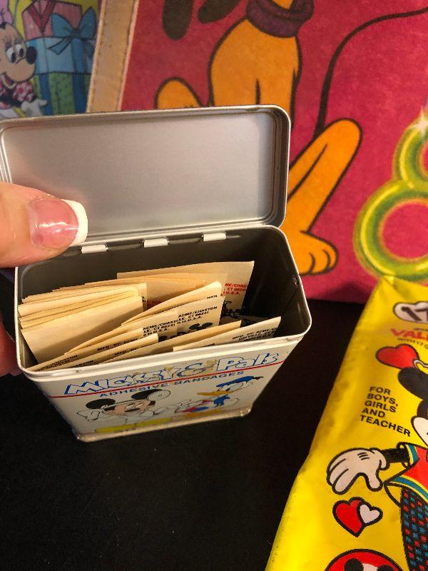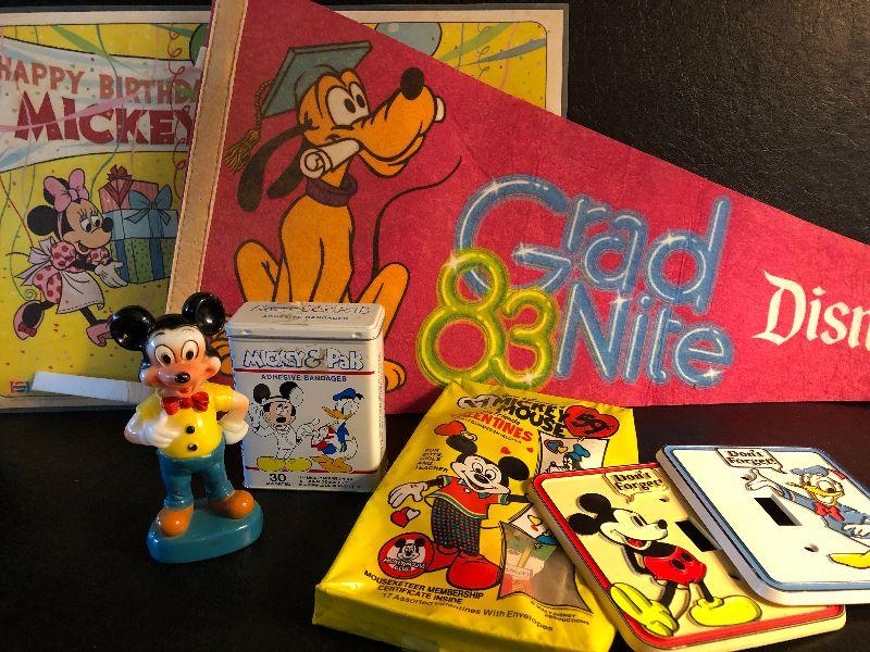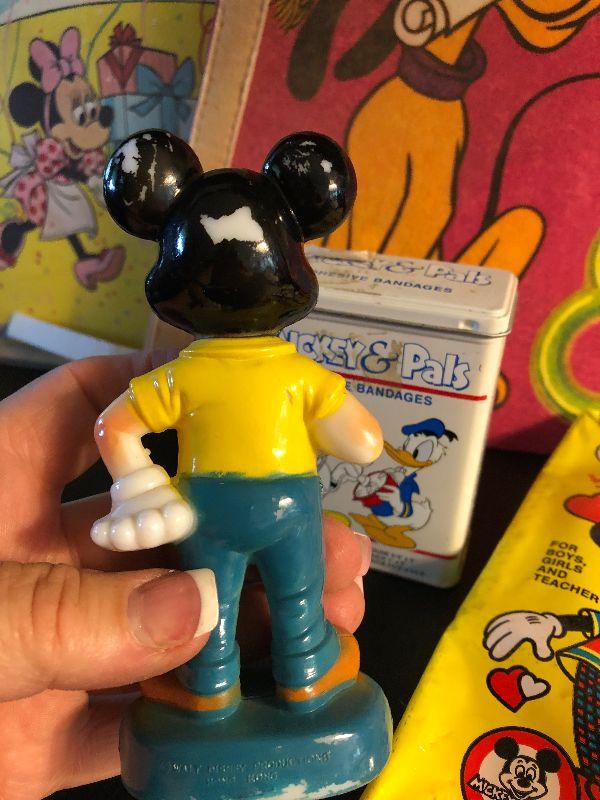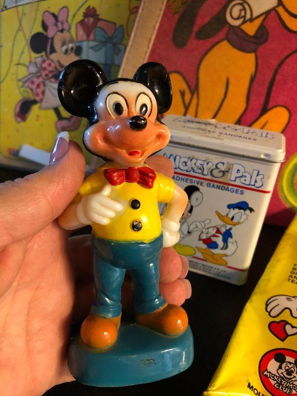 Vintage Mickey Mouse figurine, Disney bandages, placemat, pennant, Valentines and light switch plates.