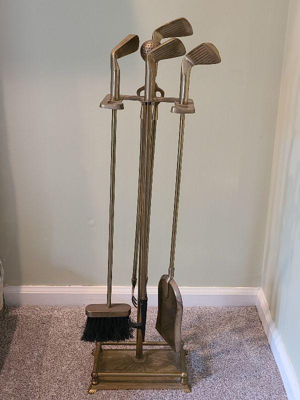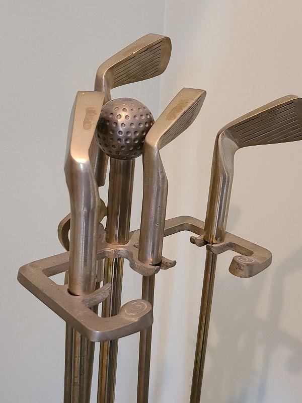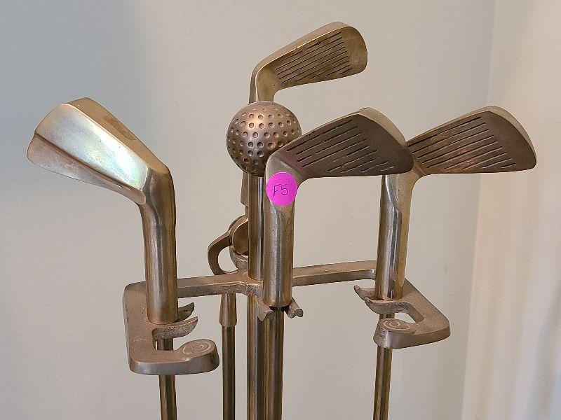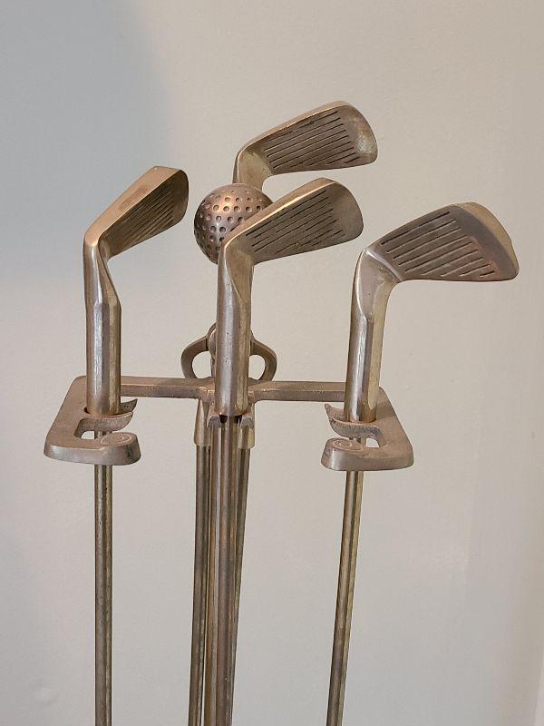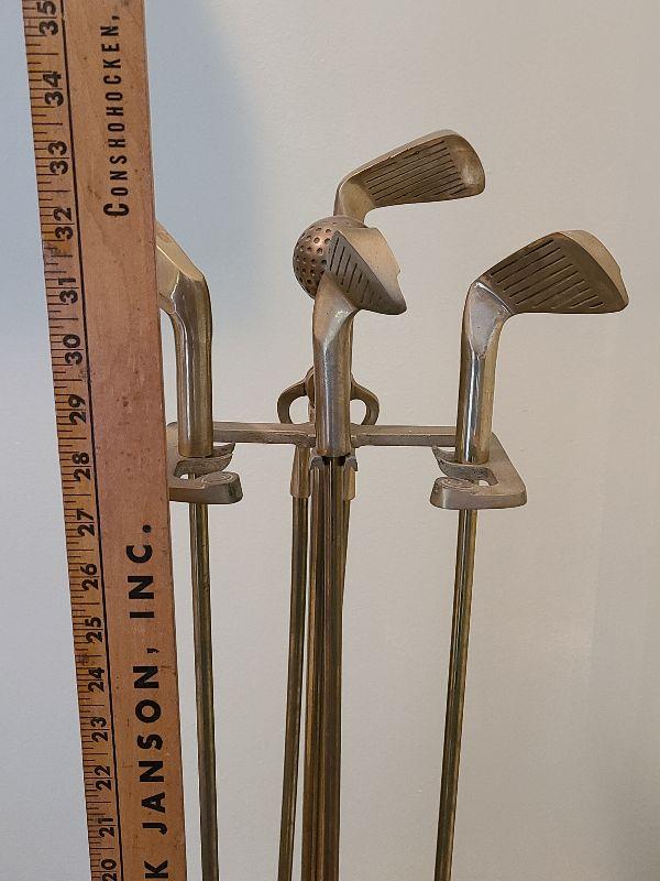 Brass golf clubs and balls adorn this fireplace iron set. Please see all pictures for contents in this listing, the condition of items in the listing, and the size if measurements were taken. Thank you for looking and have fun bidding.