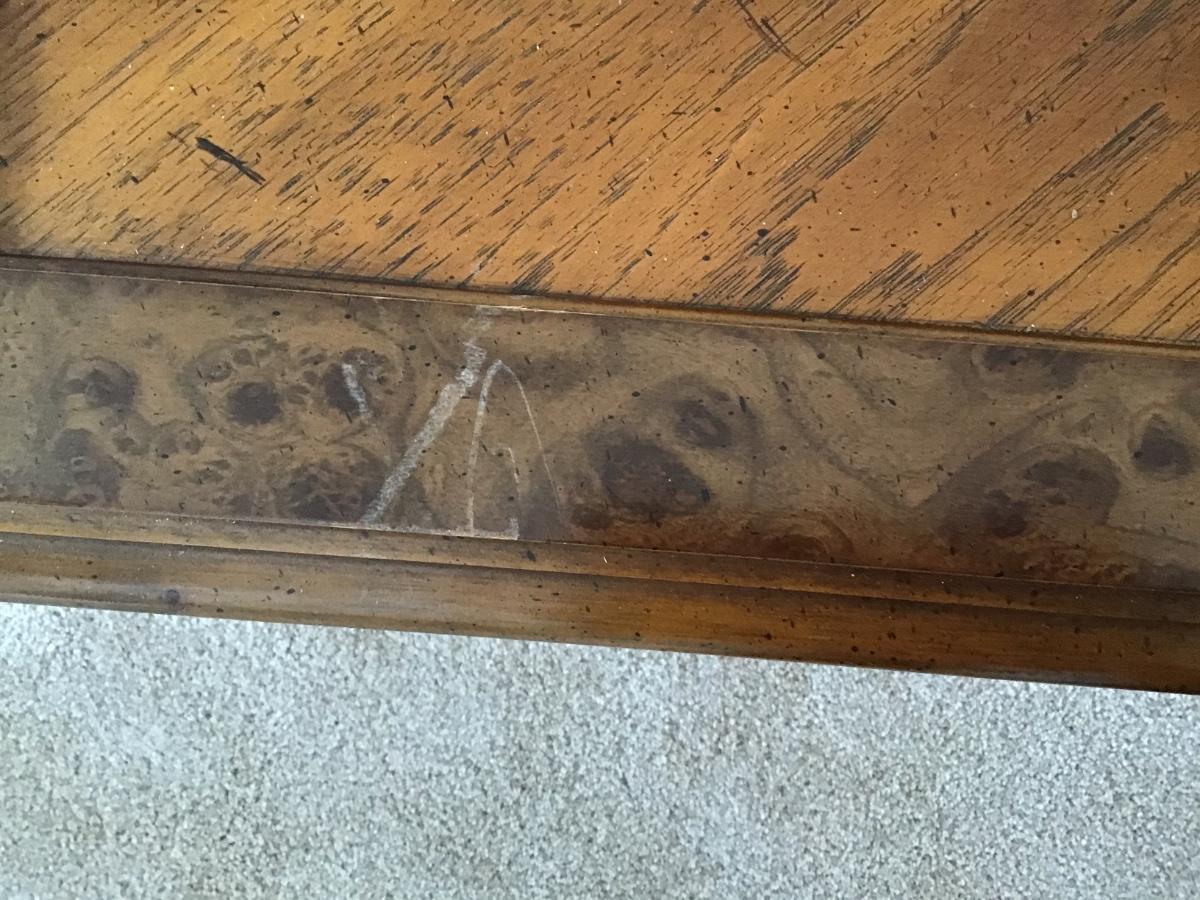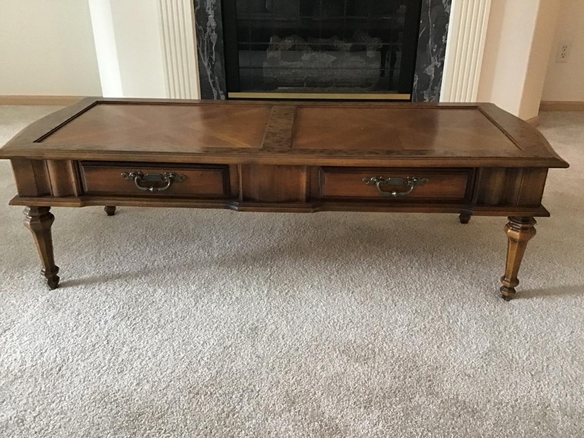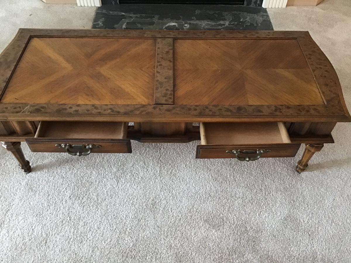 Coffee table with 2 drawers (small scratch as noted in photos). Measures 54.5”w x 19.5”d x 35.5”h