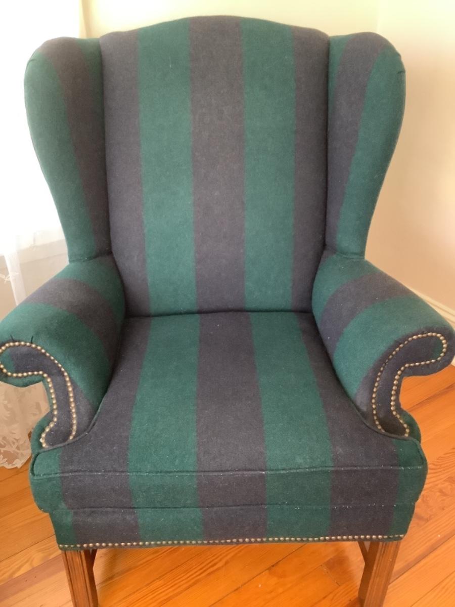 Vintage Navy & Green wool striped arm chairs by LEE Industries.