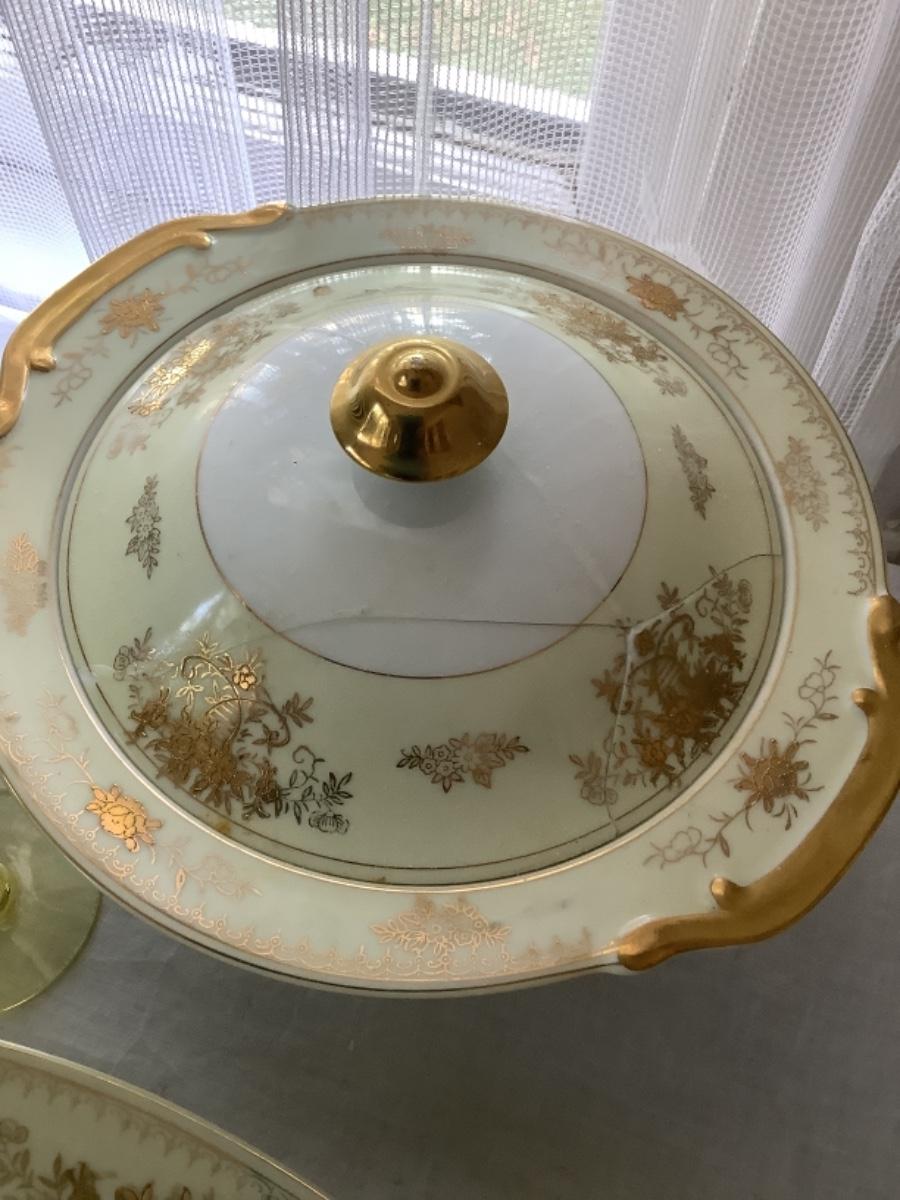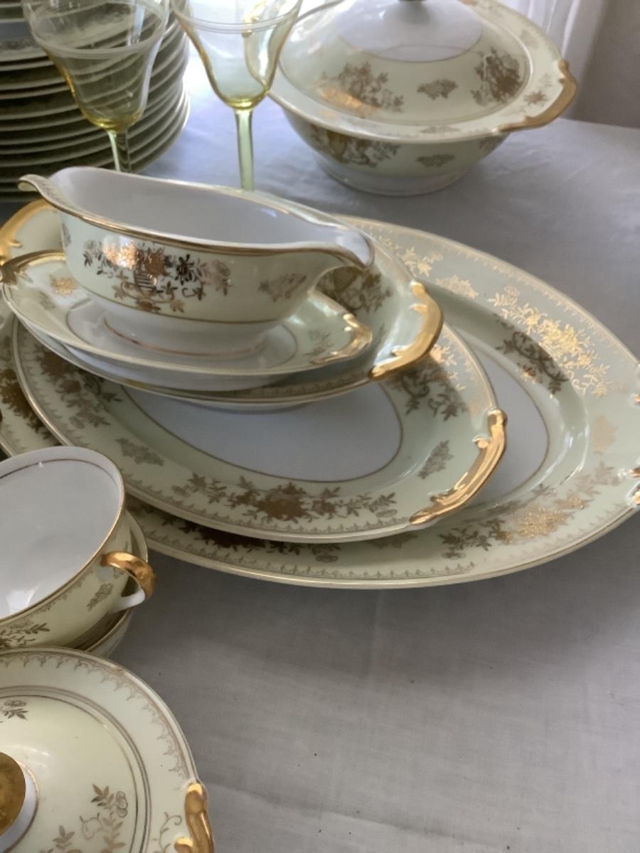 1 gravy, 1 oval vegetable bowl, small and large oval platter , 12 dinner plates , 11 bread and butter plates, 12 fruit bowls, 12 salads, 10 soups, 11 saucers, 8 tea cups, one sugar and creamer