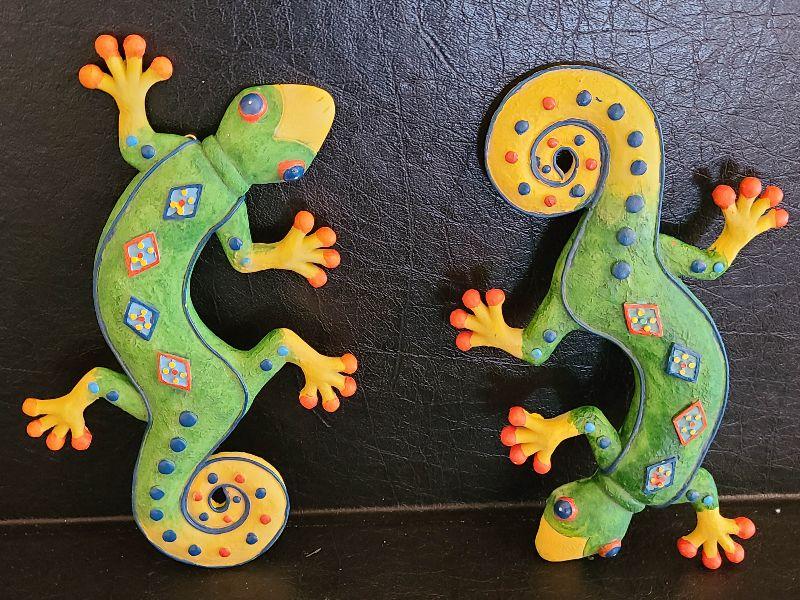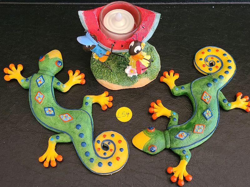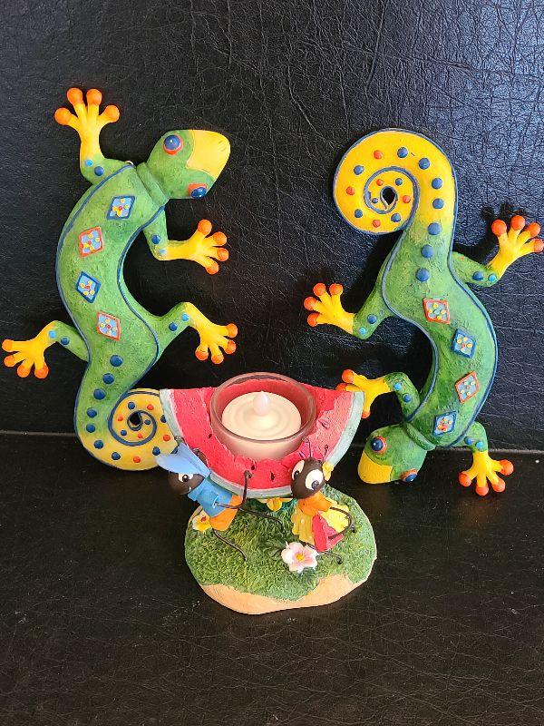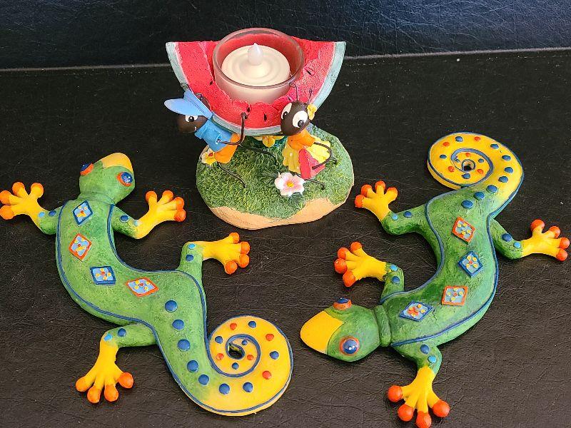 Two geckos to hang or place on table, and Yankee candle ant votive. Please see pictures for contents of the lot, condition of the lot, and any measurements of the item. Thank you for looking and happy bidding!