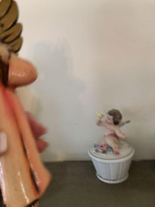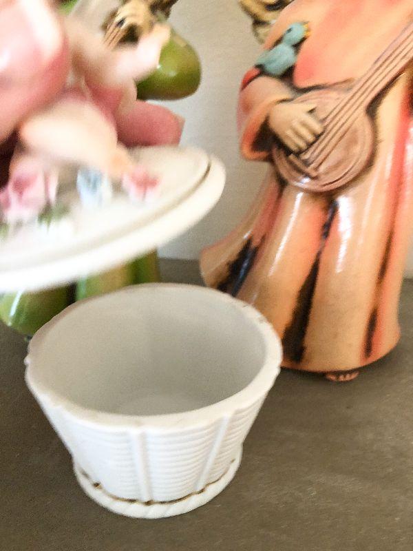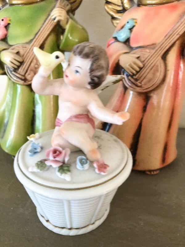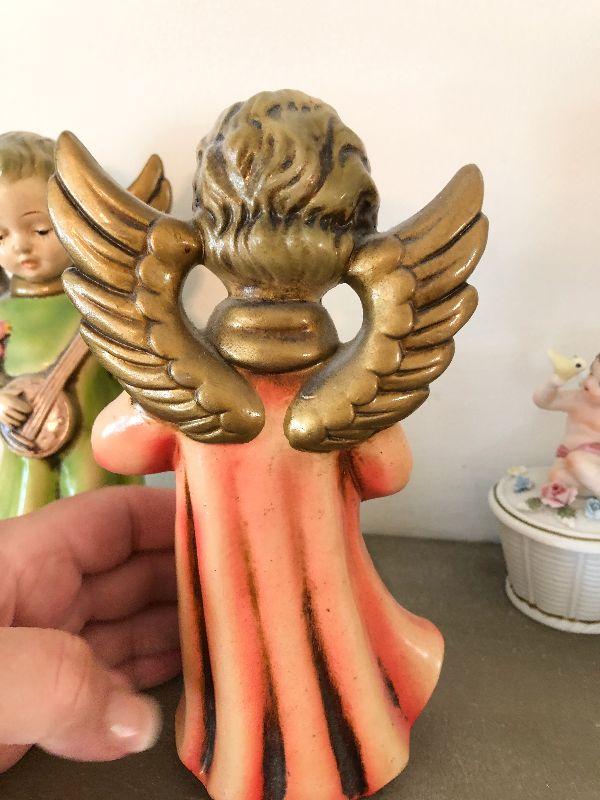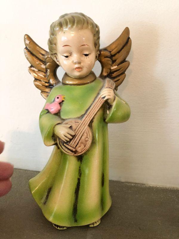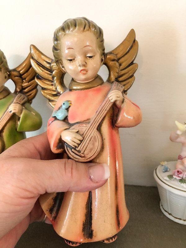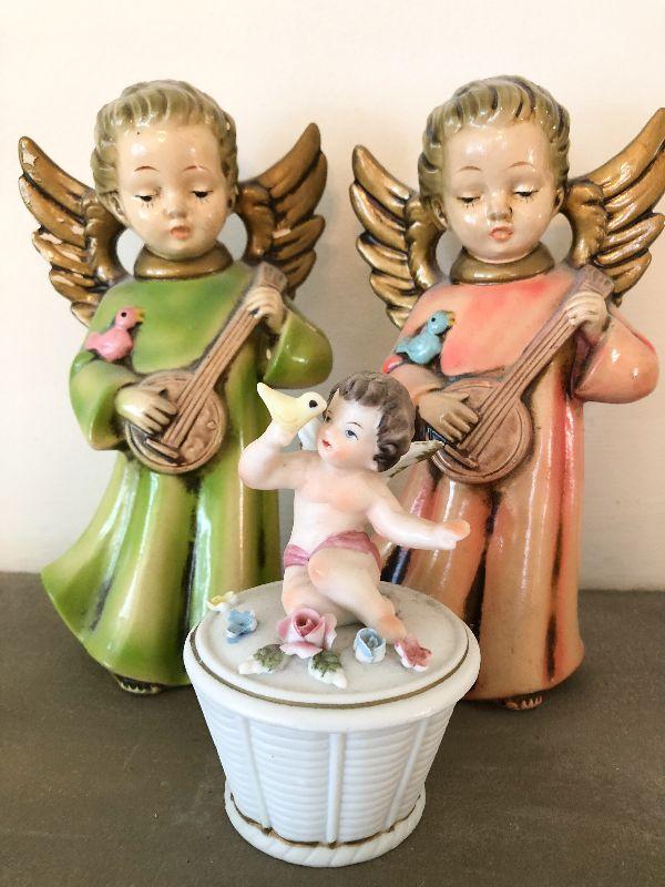 These two colorful unique angels are made in Japan but look like MCM chalk ware. They are very pretty. Small trinket box included that looks to be bisque. Please see all pictures for exact contents of the lot, condition of the items, and if measurements if taken. Thank you for looking and have fun bidding.
