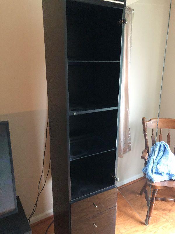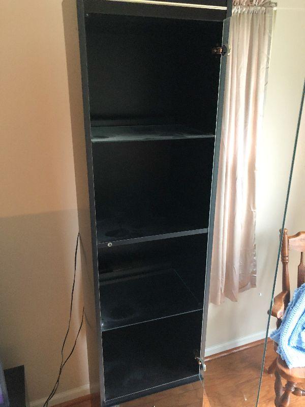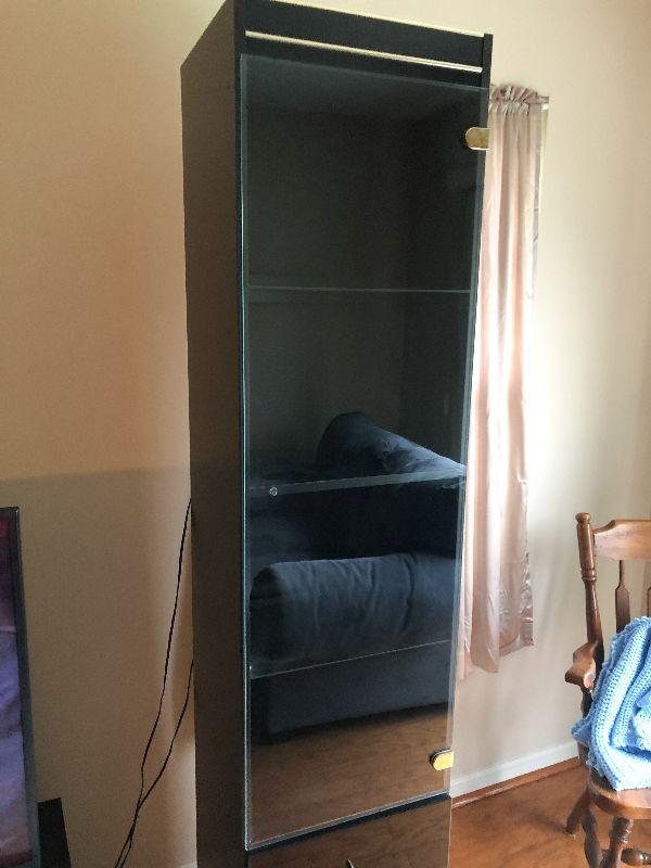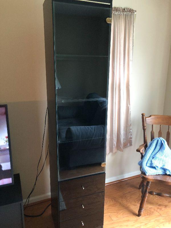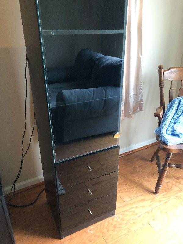 Glass front on top with three drawers below. Set of two that can put side by side or used separately
