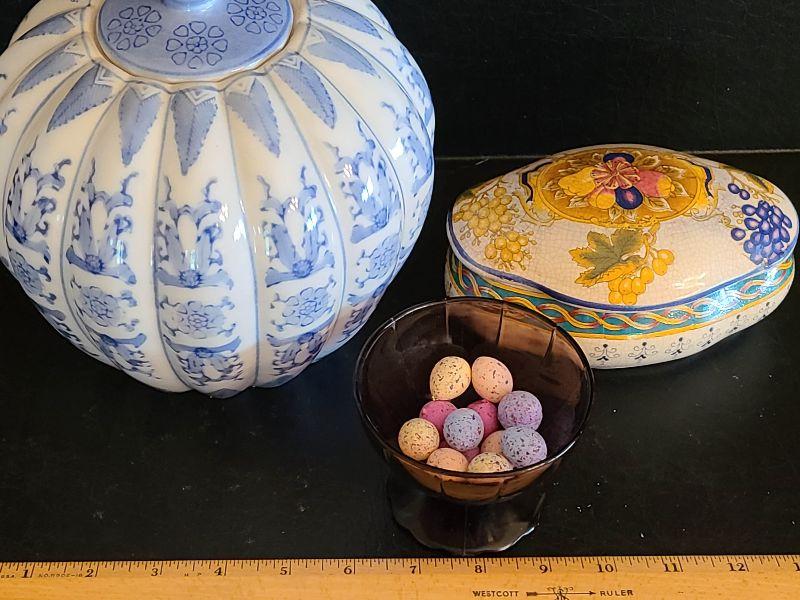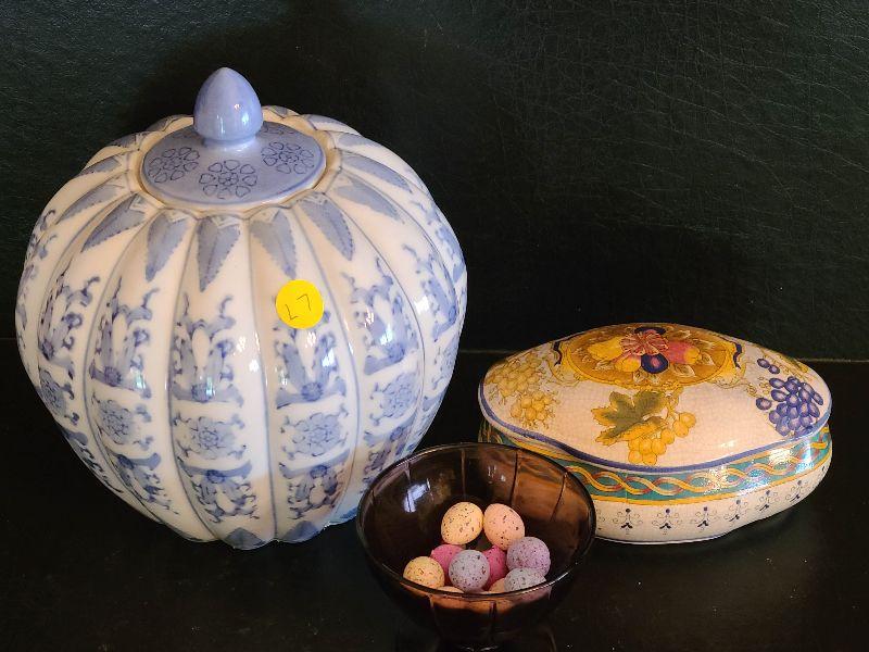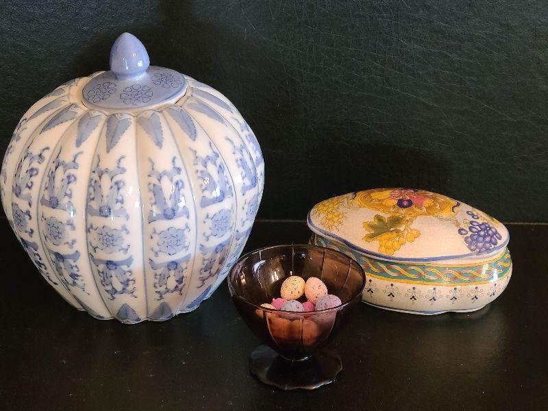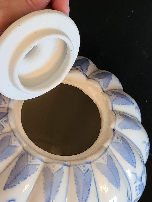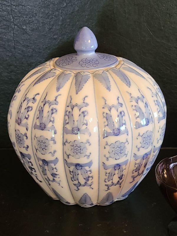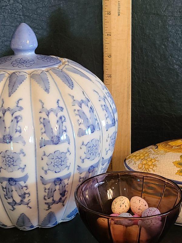 Blue and white jar perfect for matches, treats, and more. Please see pictures for contents of the lot, condition of the lot, and any measurements of the item. Thank you for looking and happy bidding!